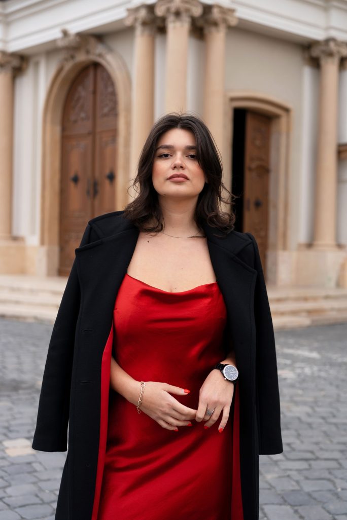 Palton negru croi clasic, cu rever, croit din stofă cu lână, căptușeală bumbac satinat rosu (la cerere se poate folosi orice culoare), lungime midi.