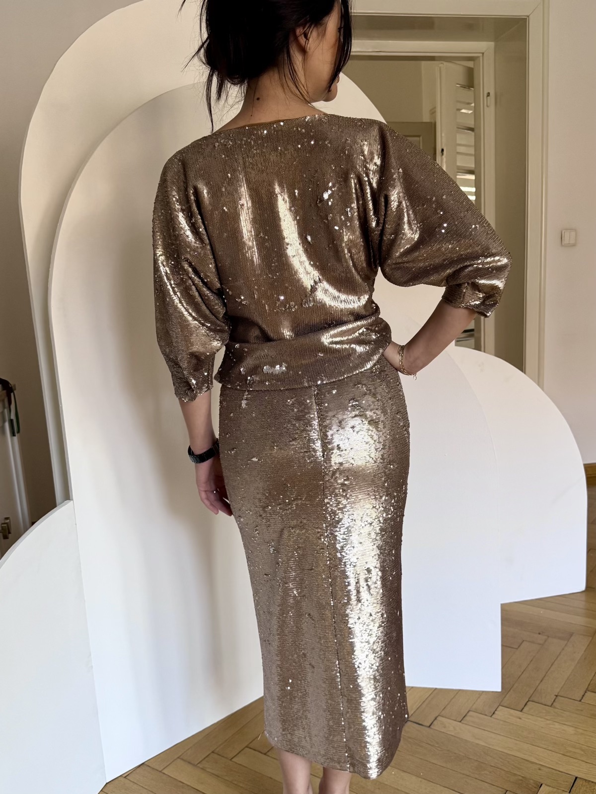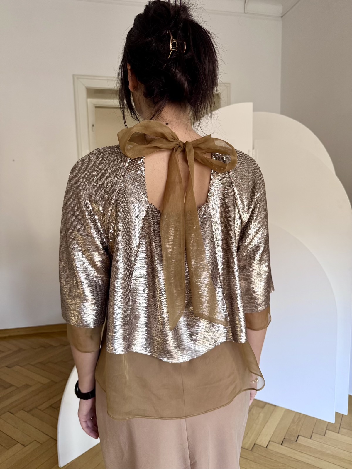 Selectează opțiunile Acest produs are mai multe variații. Opțiunile pot fi alese în pagina produsului.Bluză T paiete sampanie – M si L/38-40
