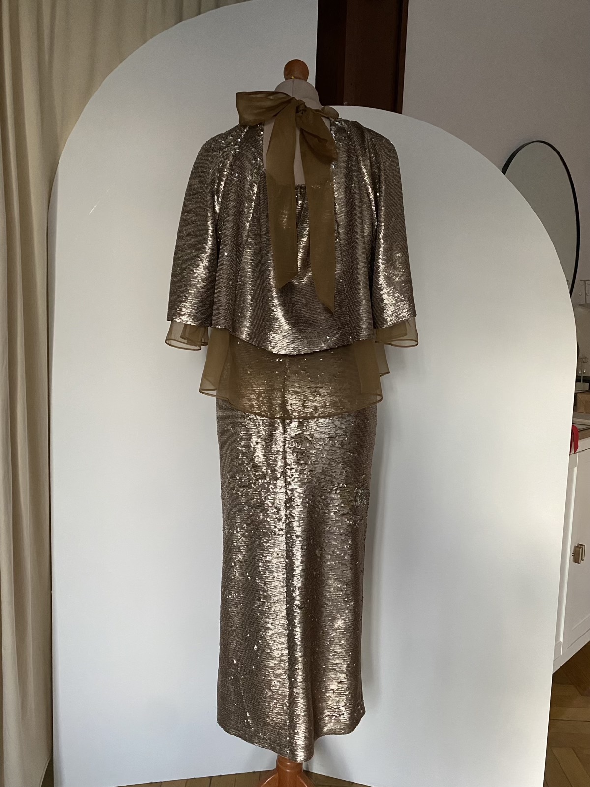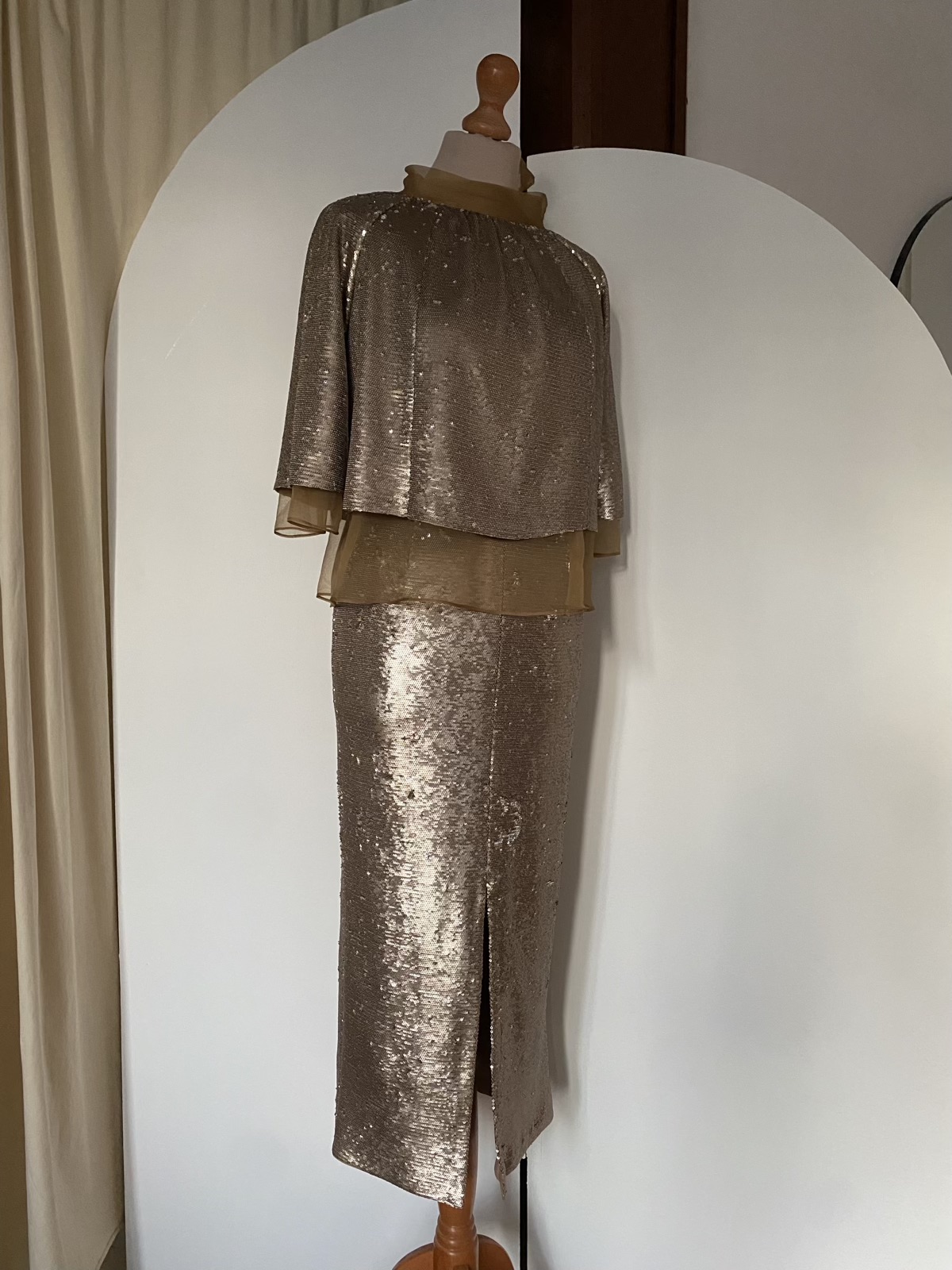 - Asortată unei fuste midi, conica, din aceleasi paiete, cu crapatura pe mijlocul de fata.