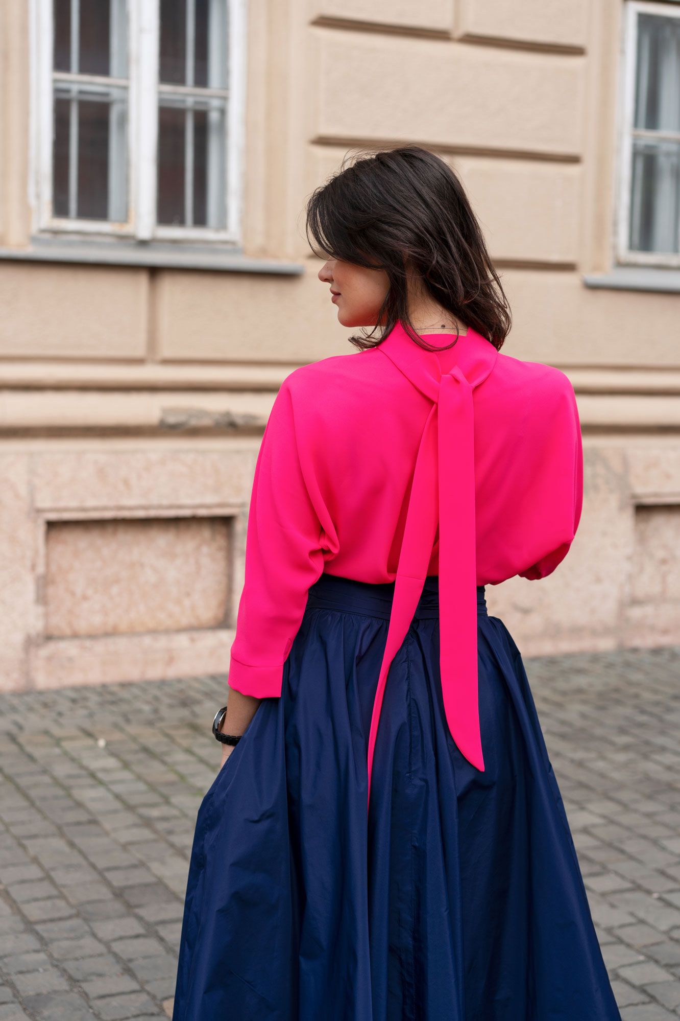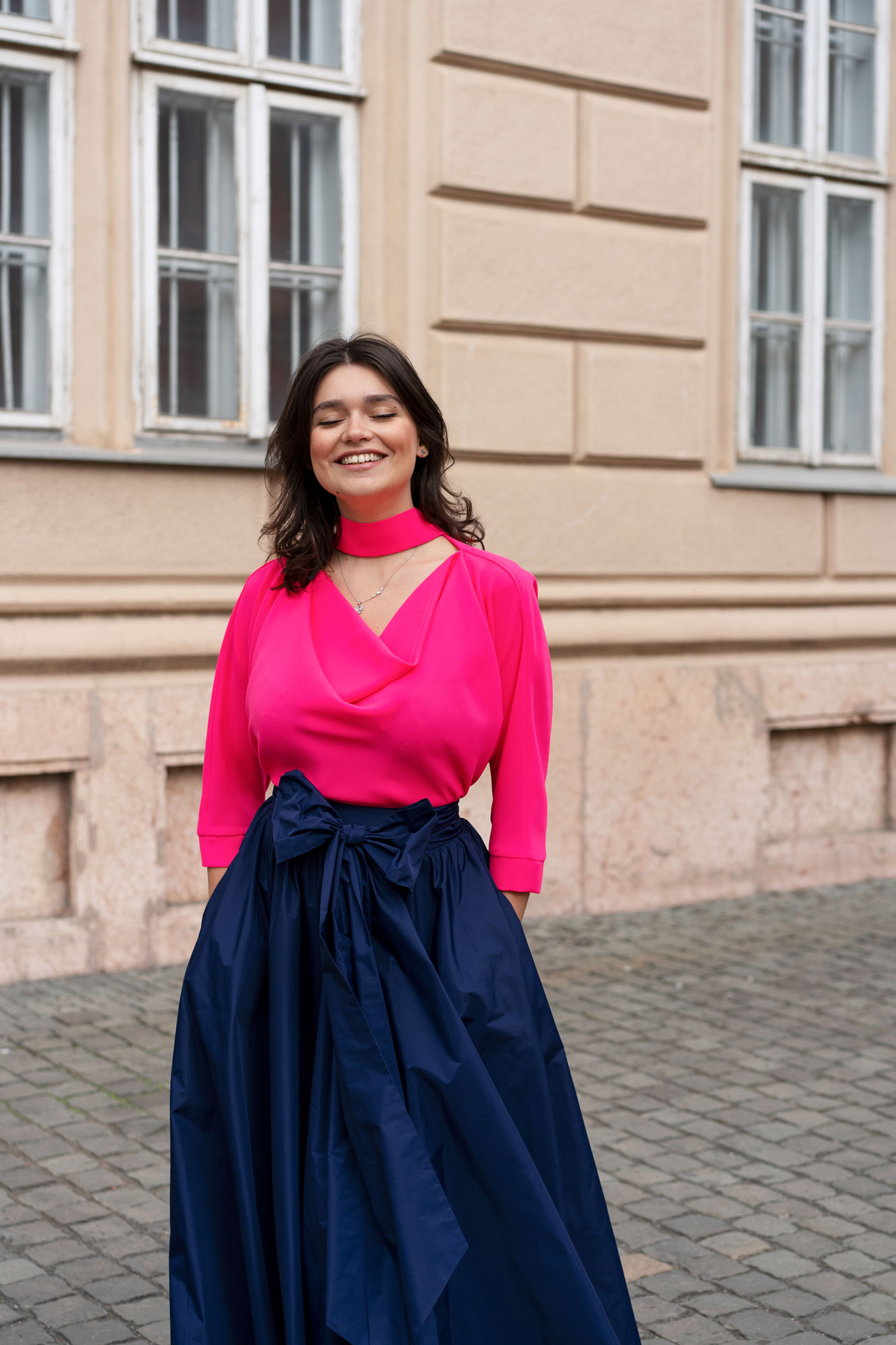 - Bluză T crep roz neon, cu croi „batwing”, din crep moale roz neon, cu croi drapat la decolteu si bentita esarfa.