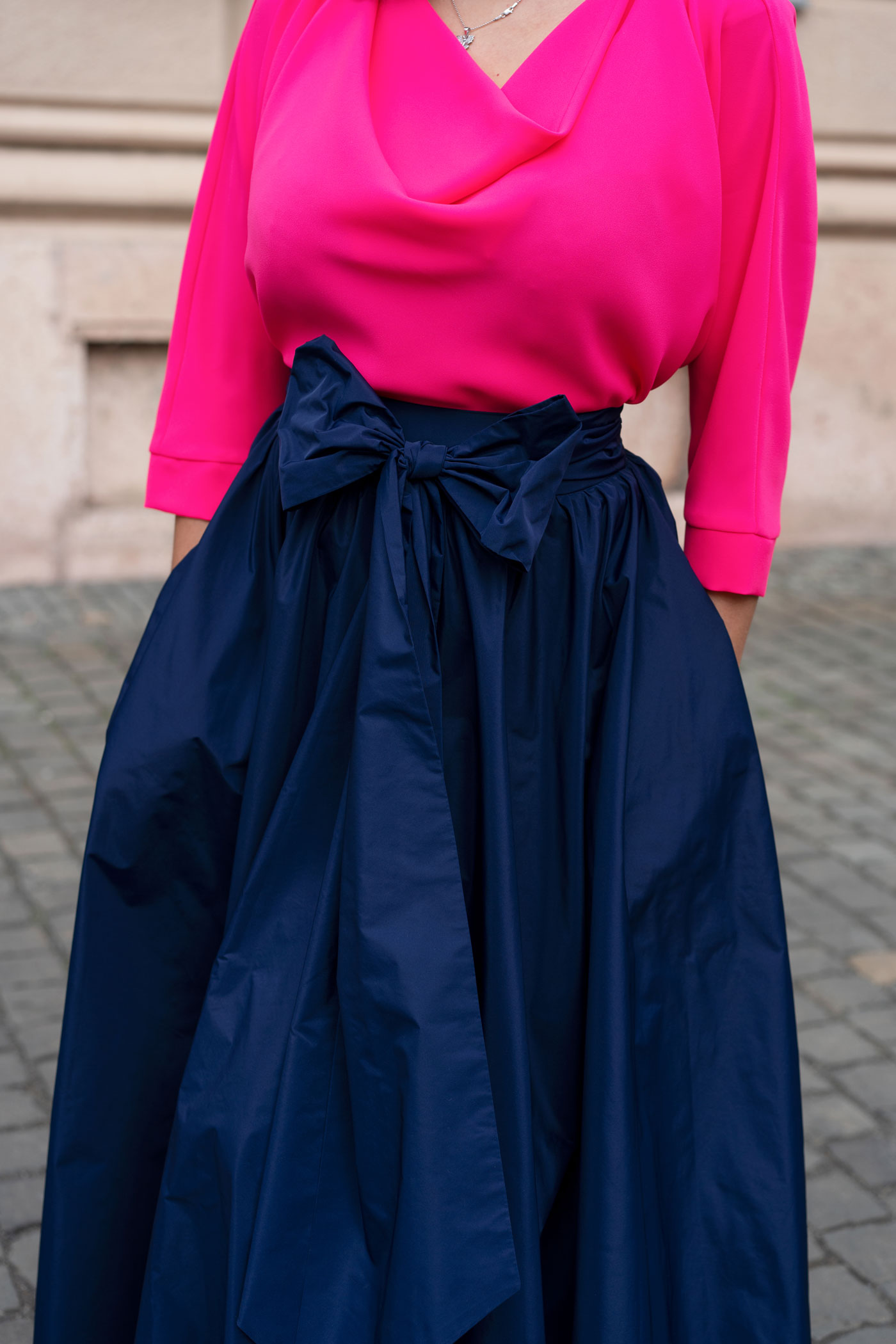 - Asortată unei fuste ample din tafta navy, cu betelie in talie si funda ce se poate lega in fata sau in spate.