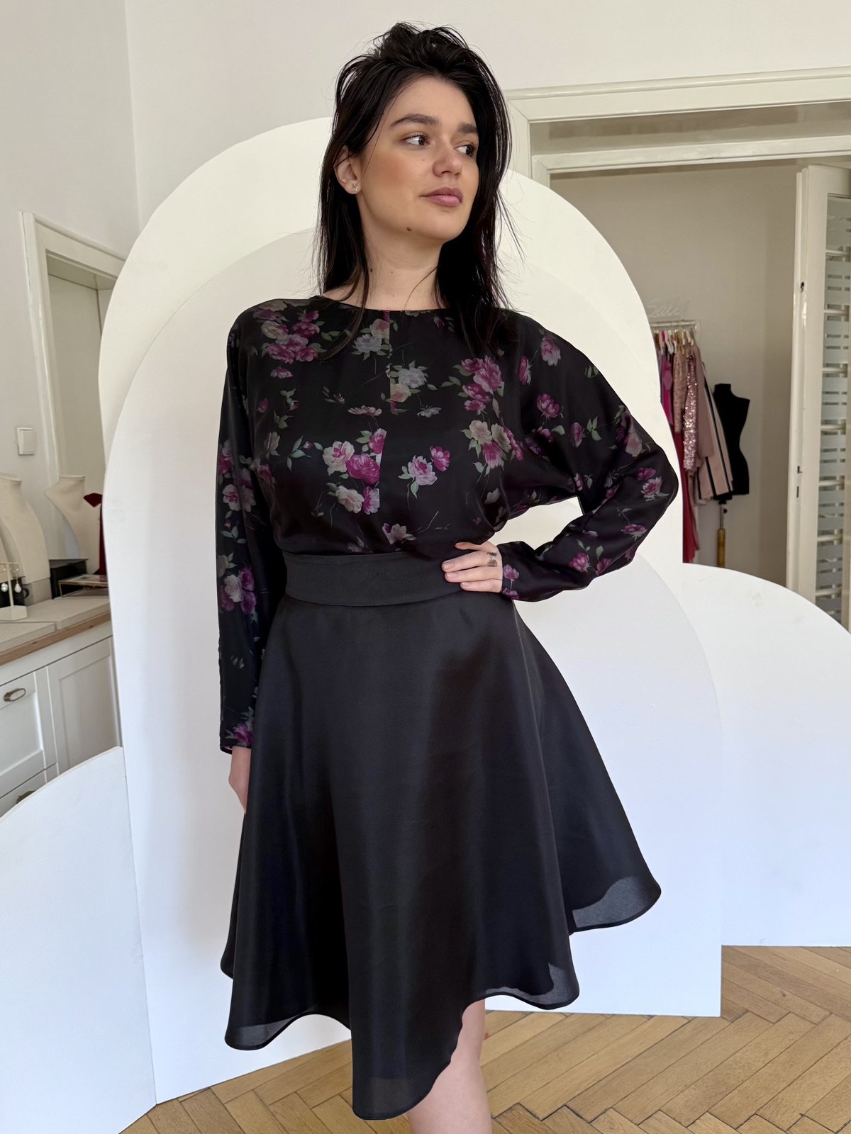 - Asortată unei fuste midi, evazata, din organza matase naturala neagra.