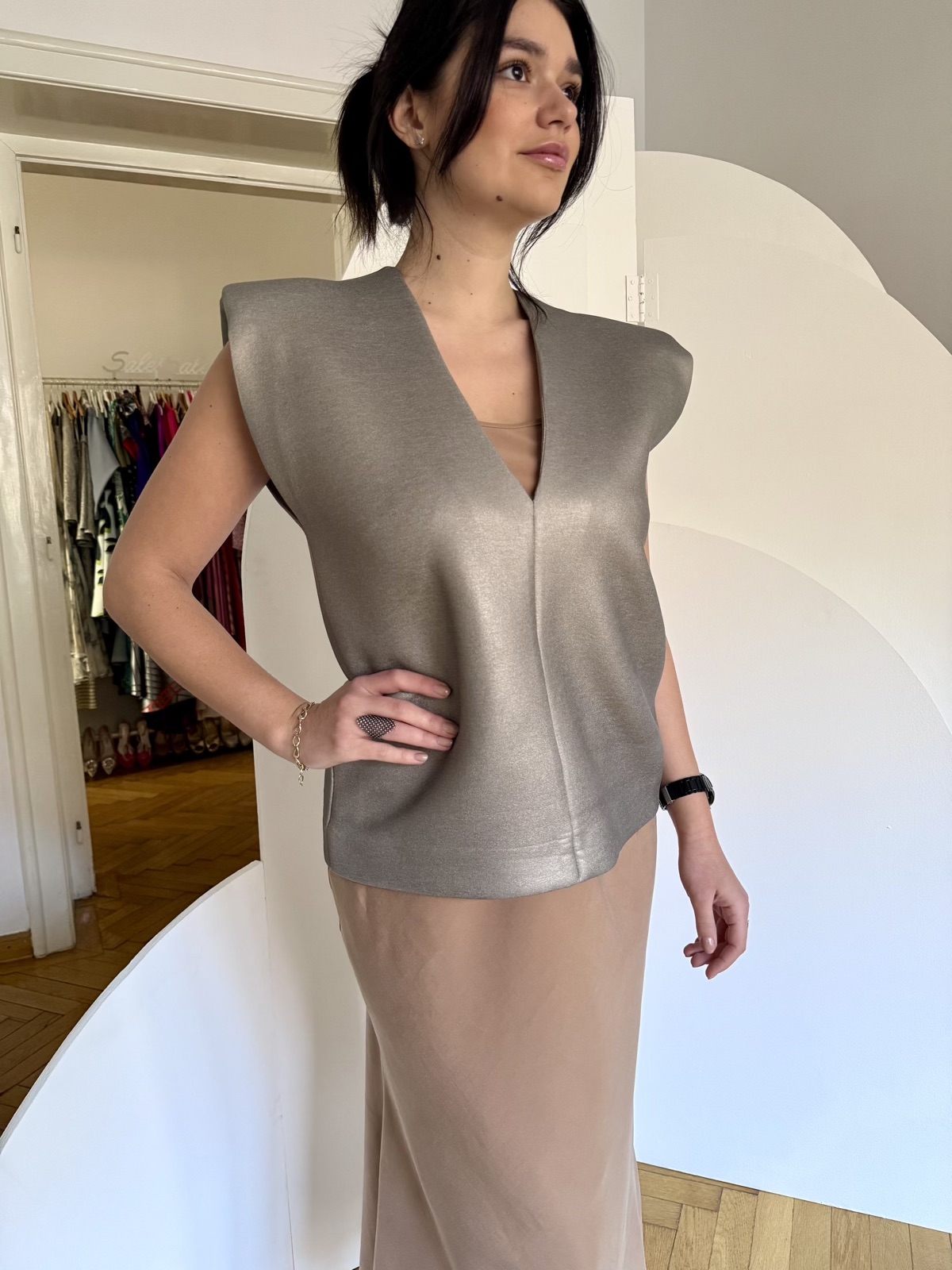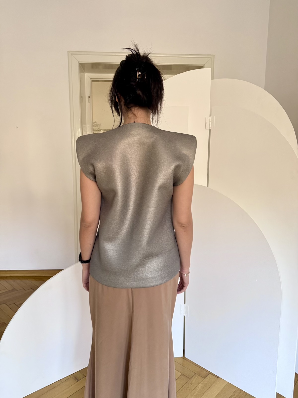 - Bluză/vestă argintie din scuba, cu croi drept, lejer, supradimensionat, cu bureti la umeri, pentru volum.