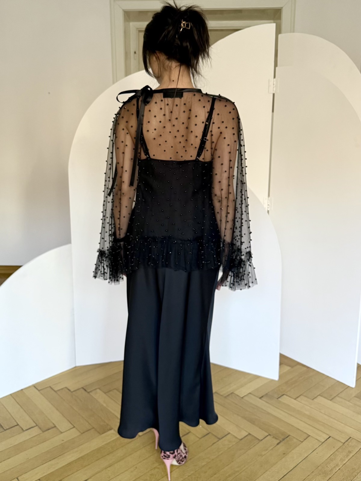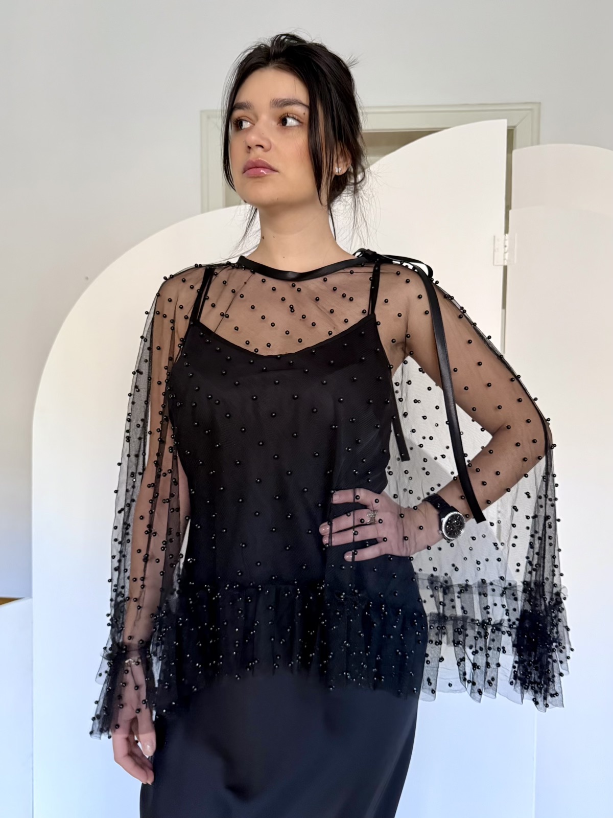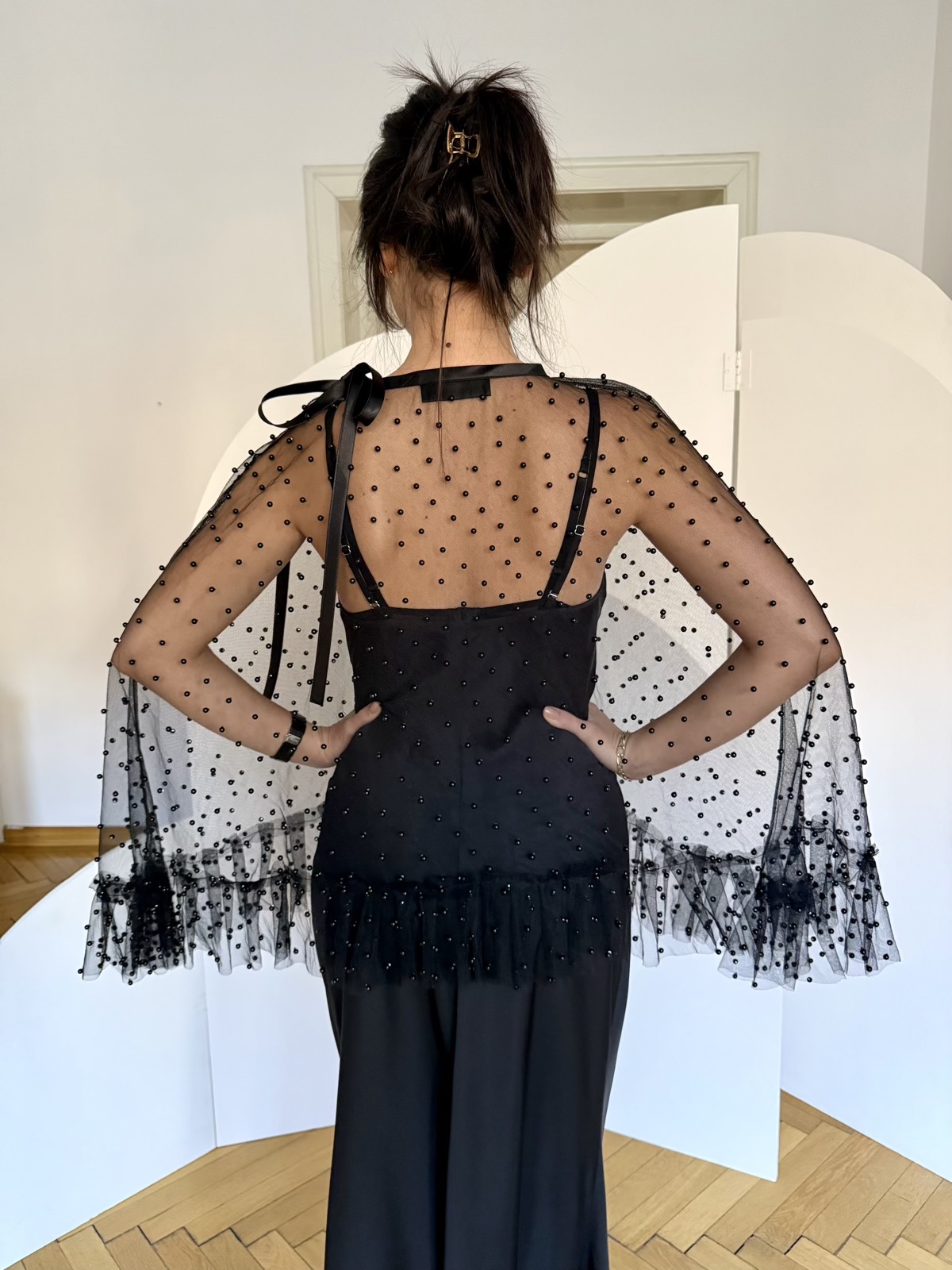 - Capă tulle negru cu perle, care se leaga cu funda satinata in jurul gatului, cu volan incretit la marginea de jos.