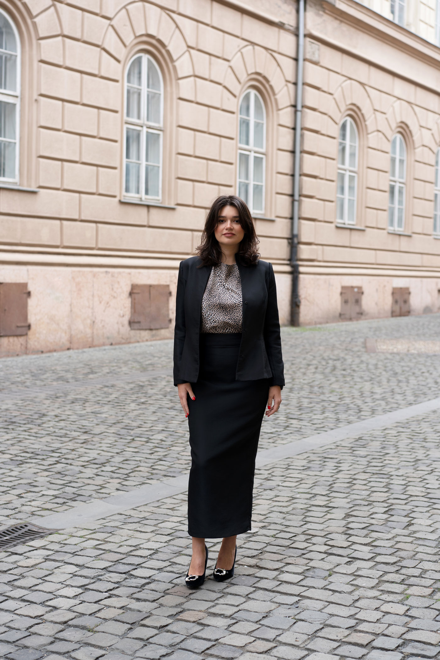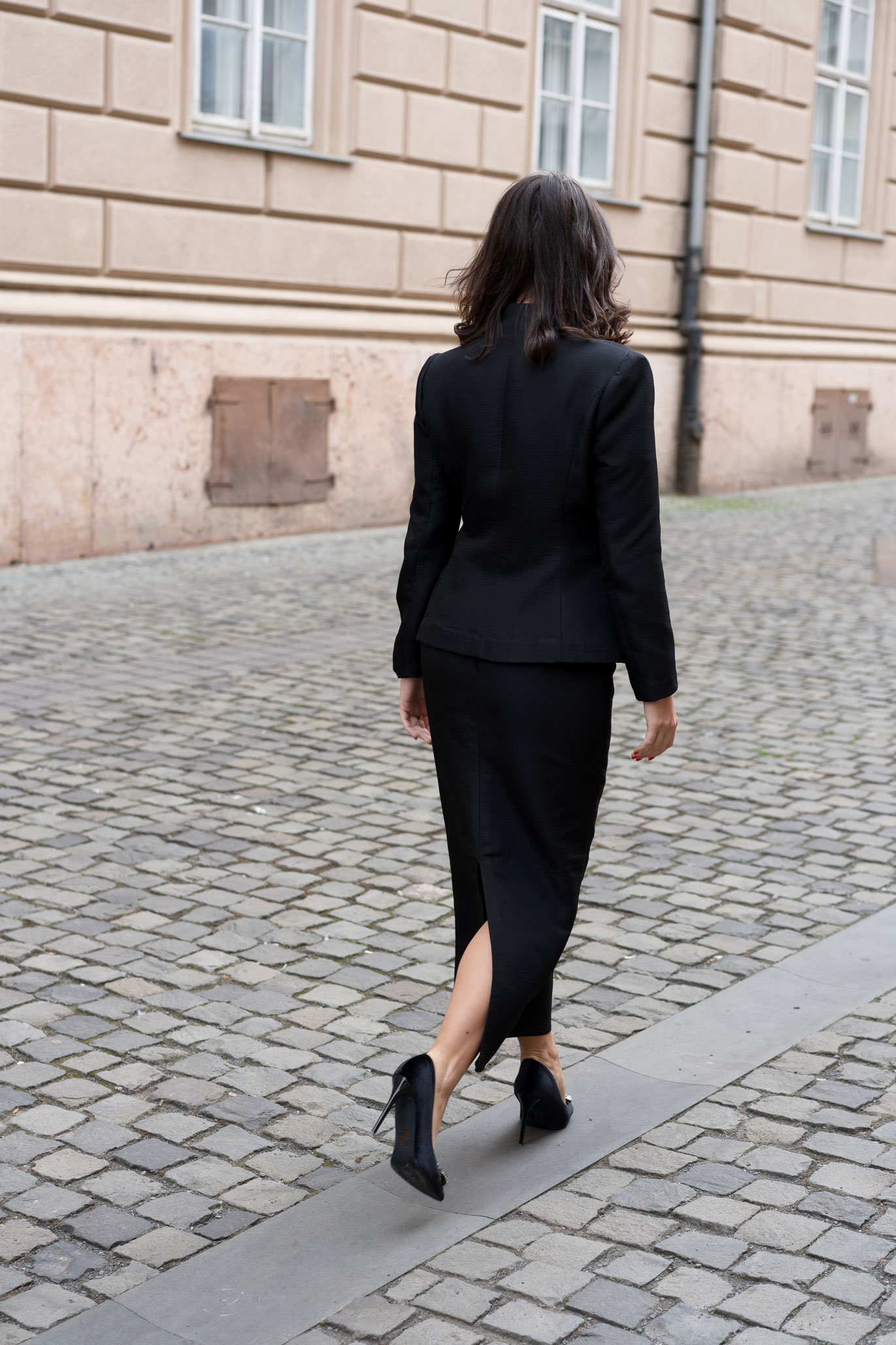 • Deux-pièces negru croit sa accentueze talie, din brocart texturat fara elastan, cu guler alungit, mijloc de fata petrecut si inchidere cu capse ascunse.