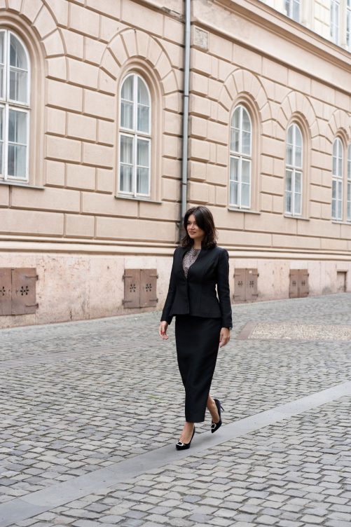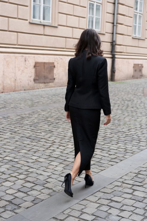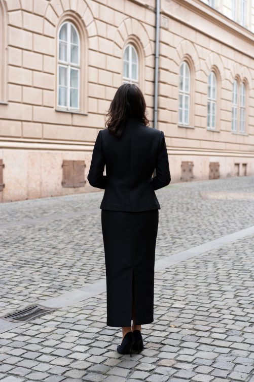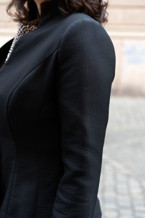 • Deux-pièces negru croit sa accentueze talie, din brocart texturat fara elastan, cu guler alungit, mijloc de fata petrecut si inchidere cu capse ascunse.