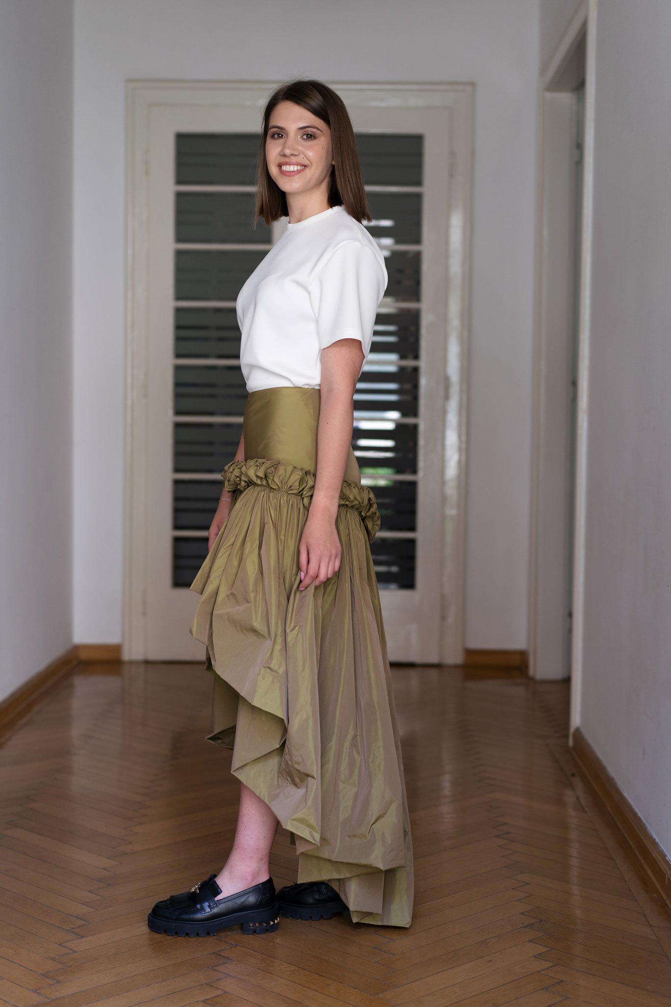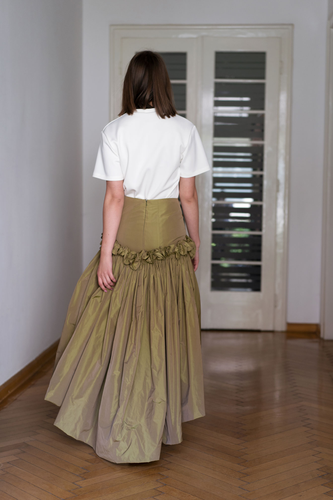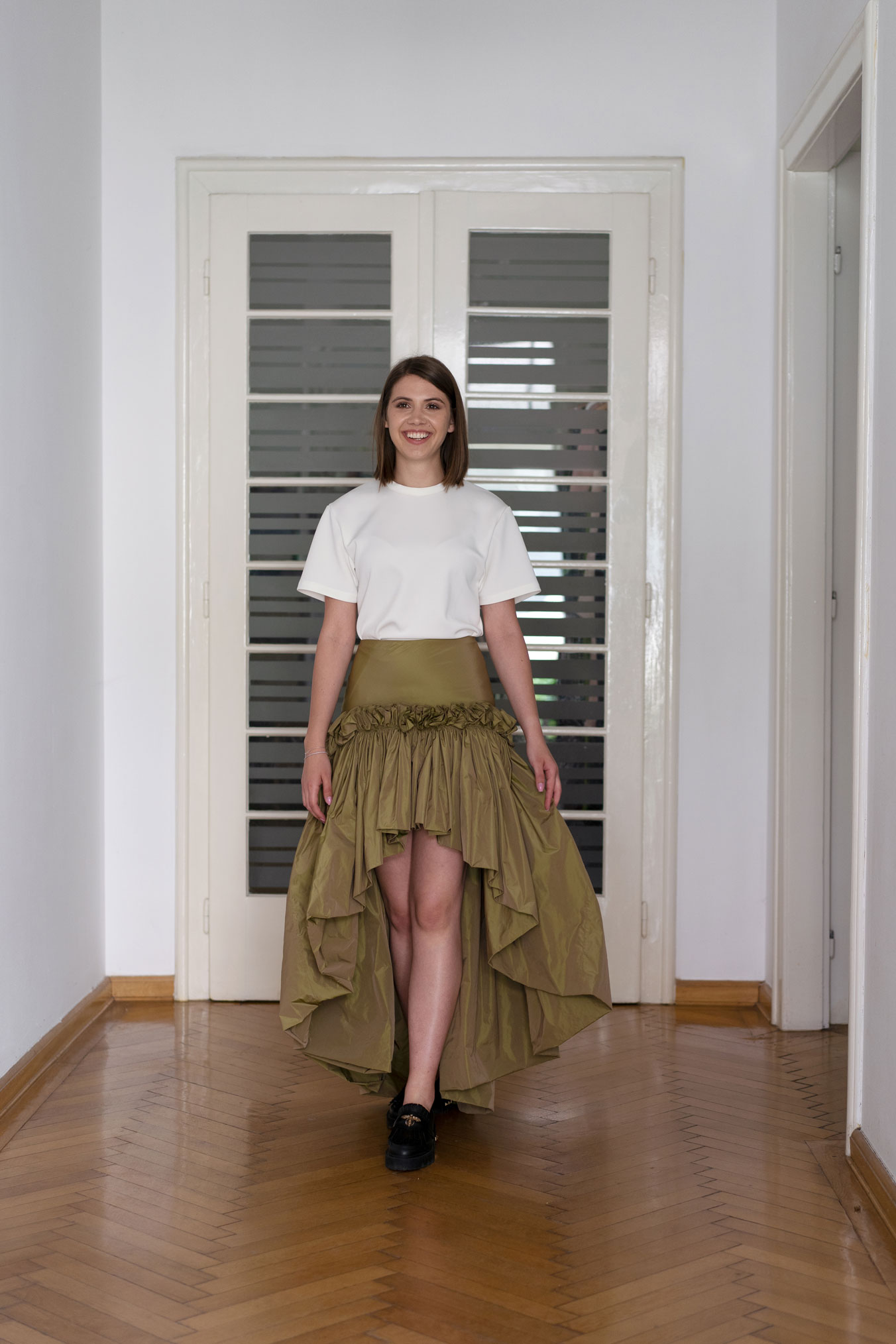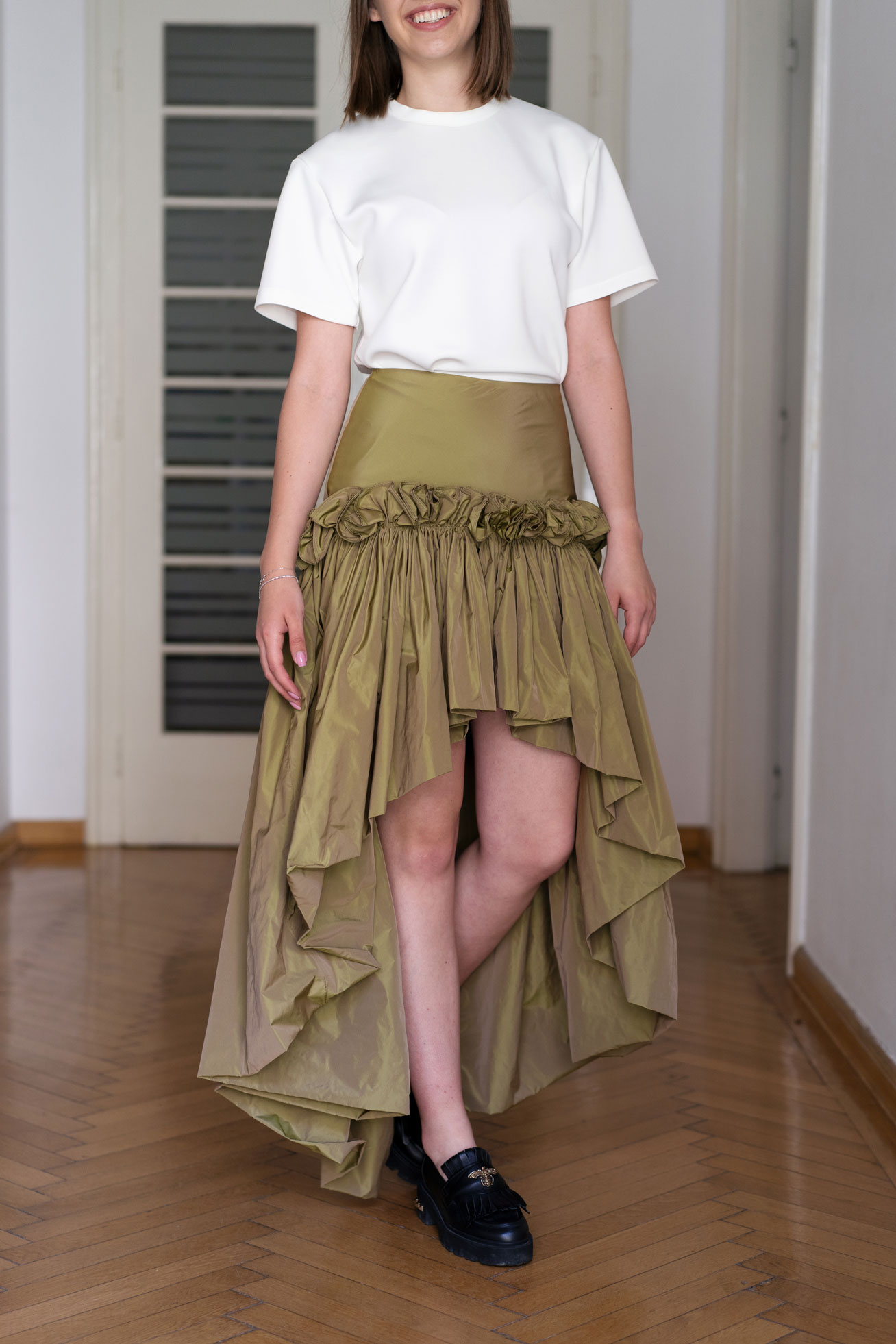 Fustă FLO cu volan bufant scurt în față și lung în spate din tafta fâș pe nuanța khaki. Aceasta se poate proba la atelier, mărime S/38.