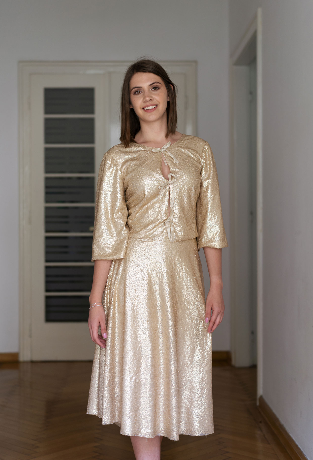 - Fustă midi croită pe bie din paiete aurii.