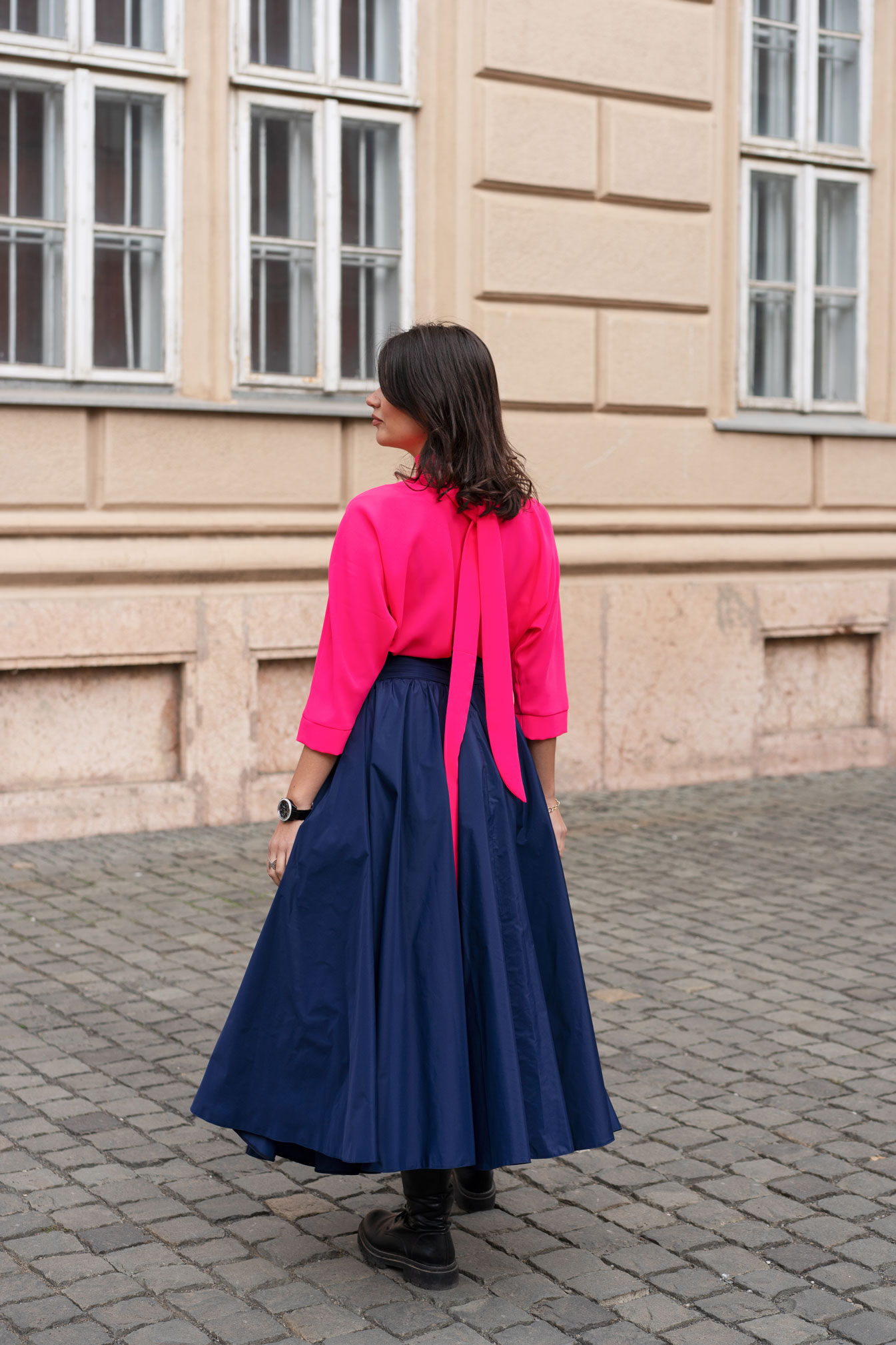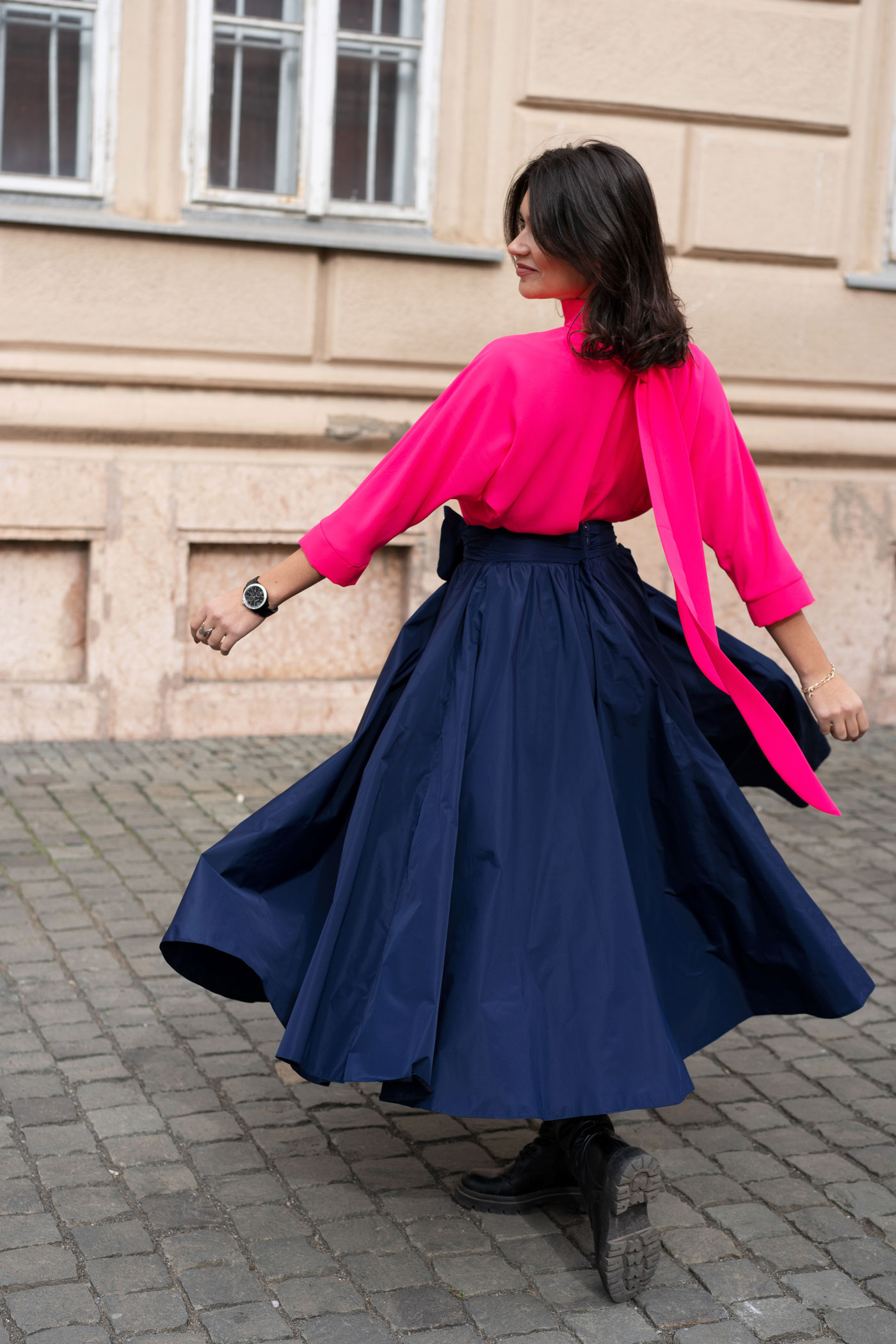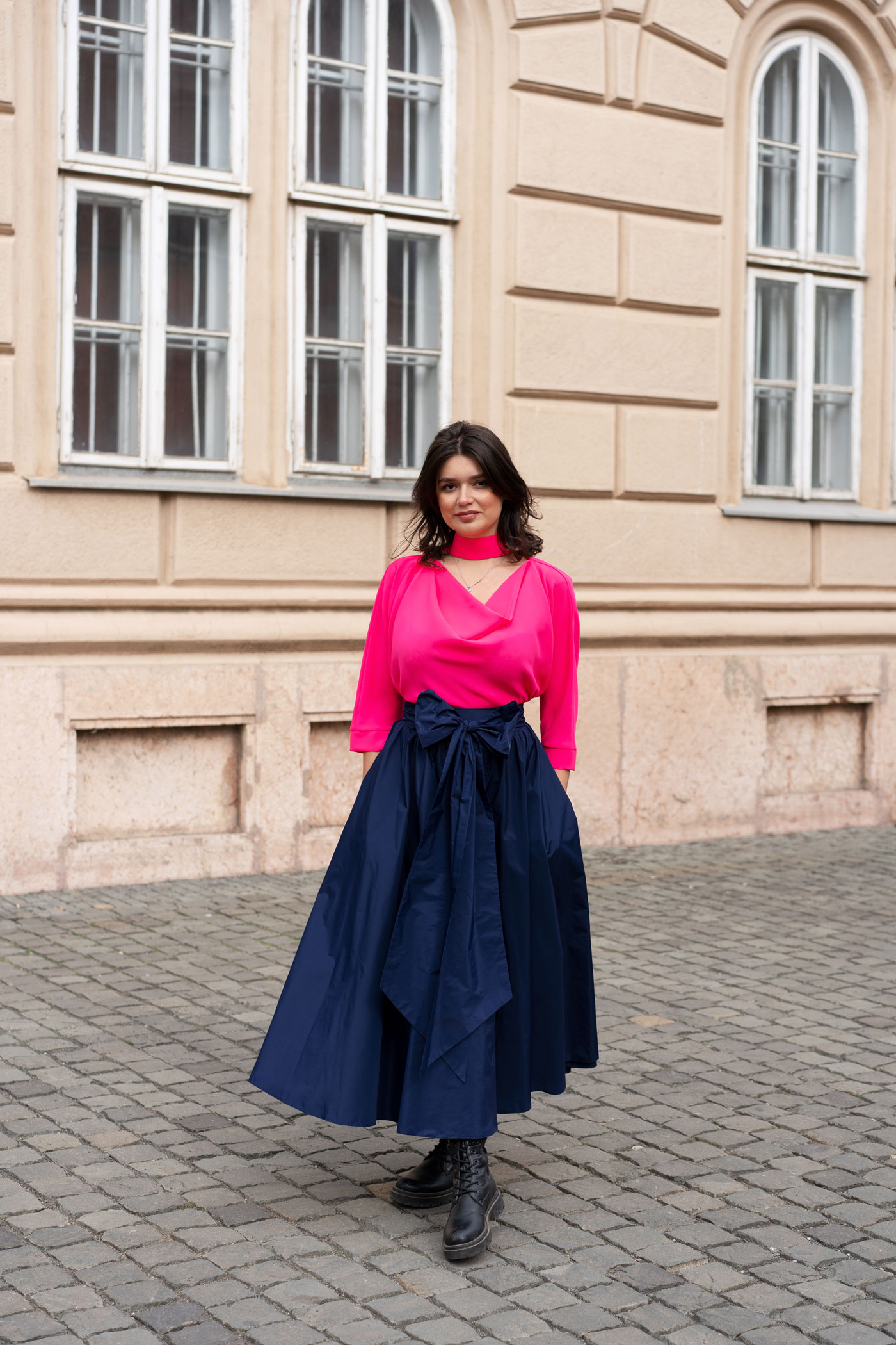 - Fustă midi navy cu buzunare, croită pe bie dublu din tafta fash, cu betelie intarita in talie și fundă ce se poate lega in fata sau la spate.