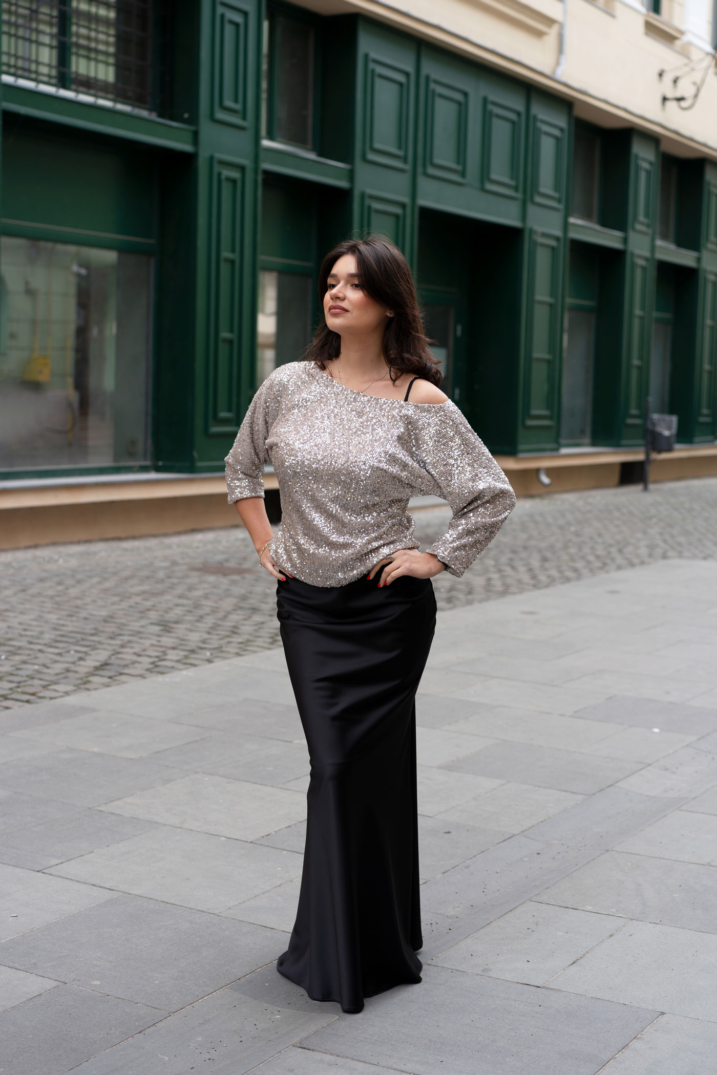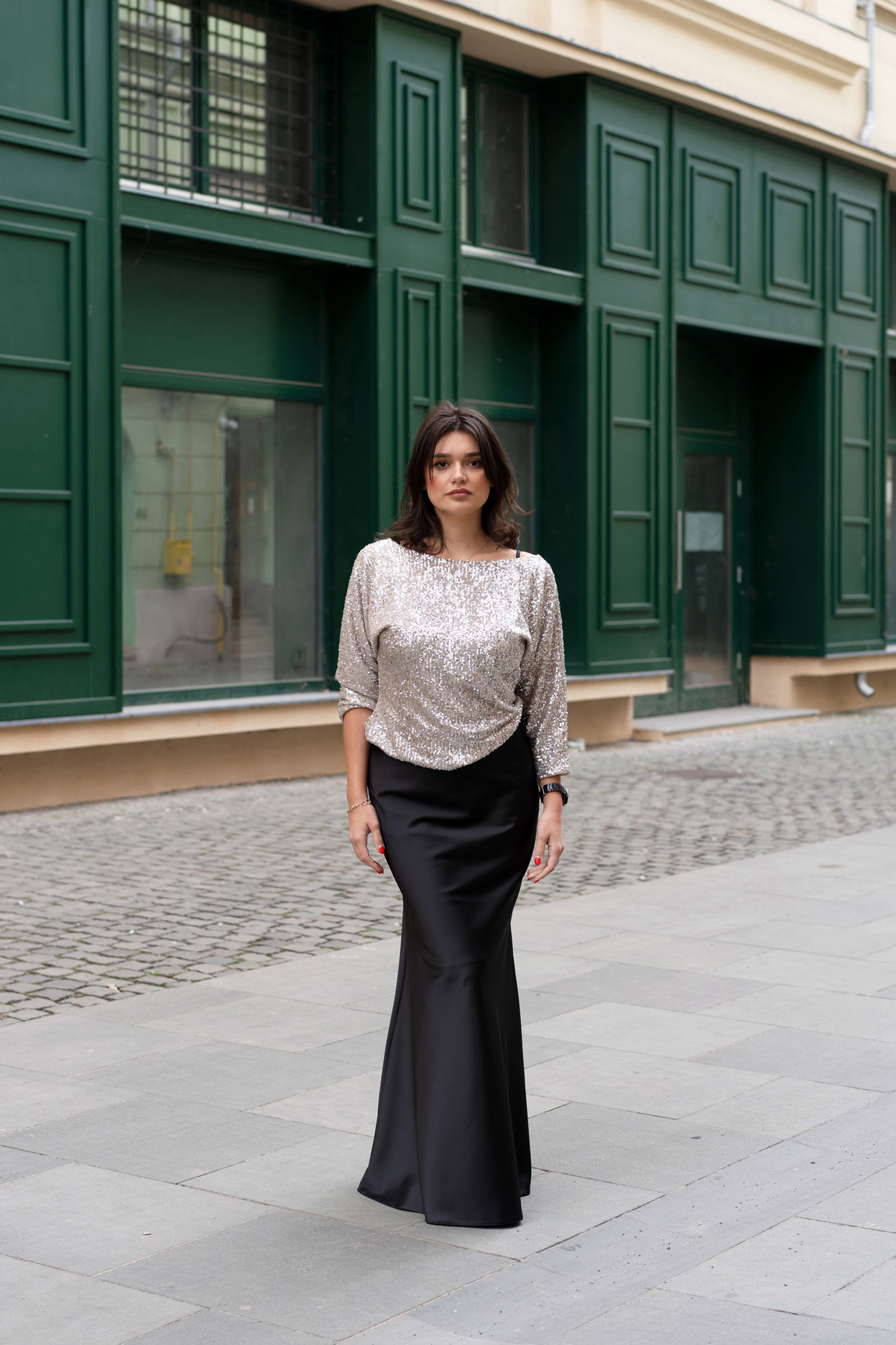 • Fustă maxi slip satin negru, croită pe bie sa urmeze linia corpului, din tafta satinata, moale, cu volum in partea de jos.
