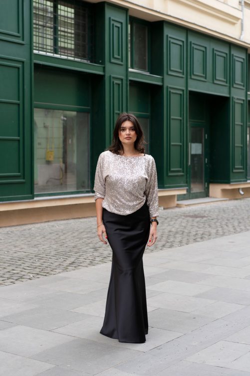 • Fustă maxi slip satin negru, croită pe bie sa urmeze linia corpului, din tafta satinata, moale, cu volum in partea de jos.
