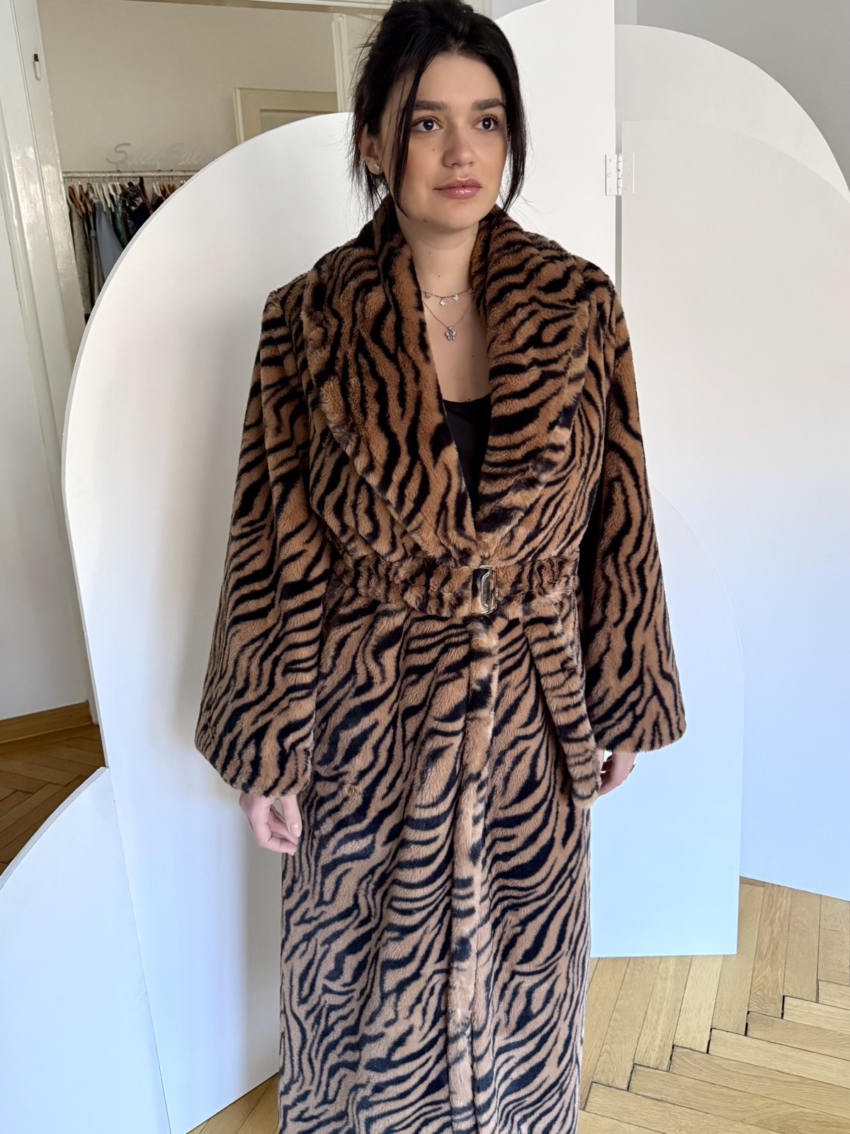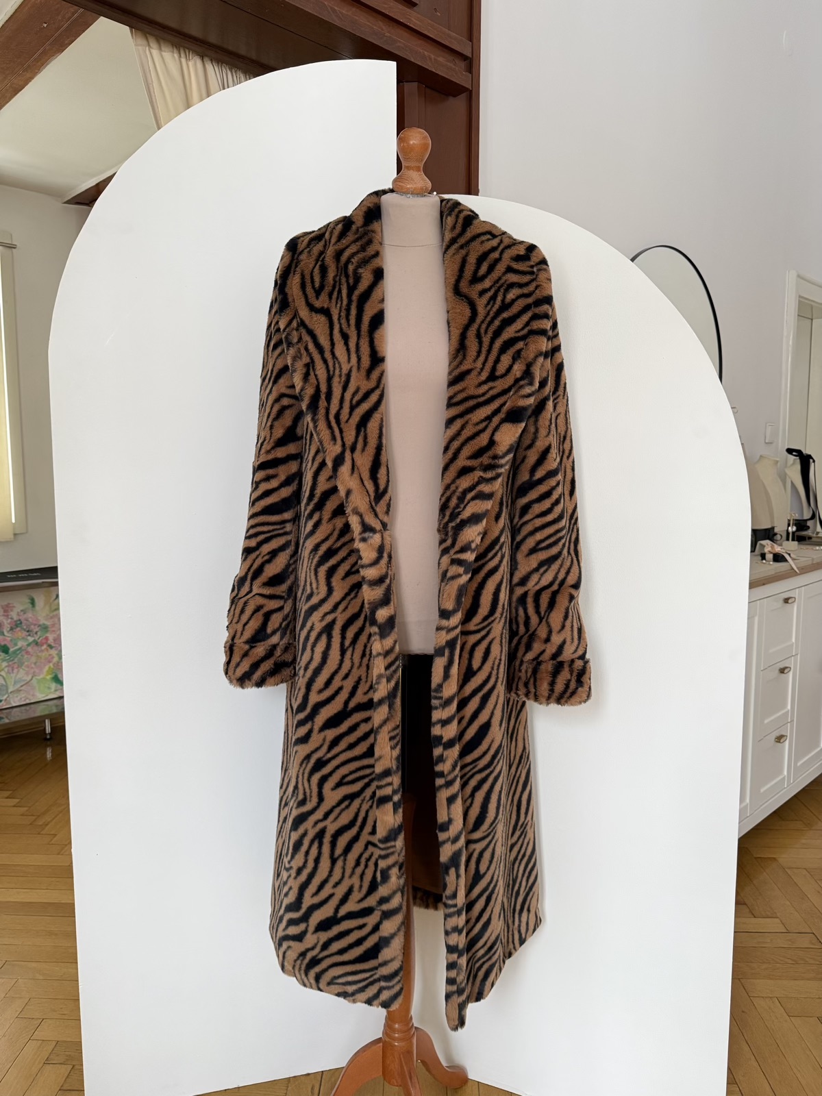 Palton midi blănită tigru, cu rever rotunjit, croit din blanita foarte fina cu model de tigru, cu căptușeală scuba din crep caramel (la fel cum este rochia cu nasturi aurii din poza principala).