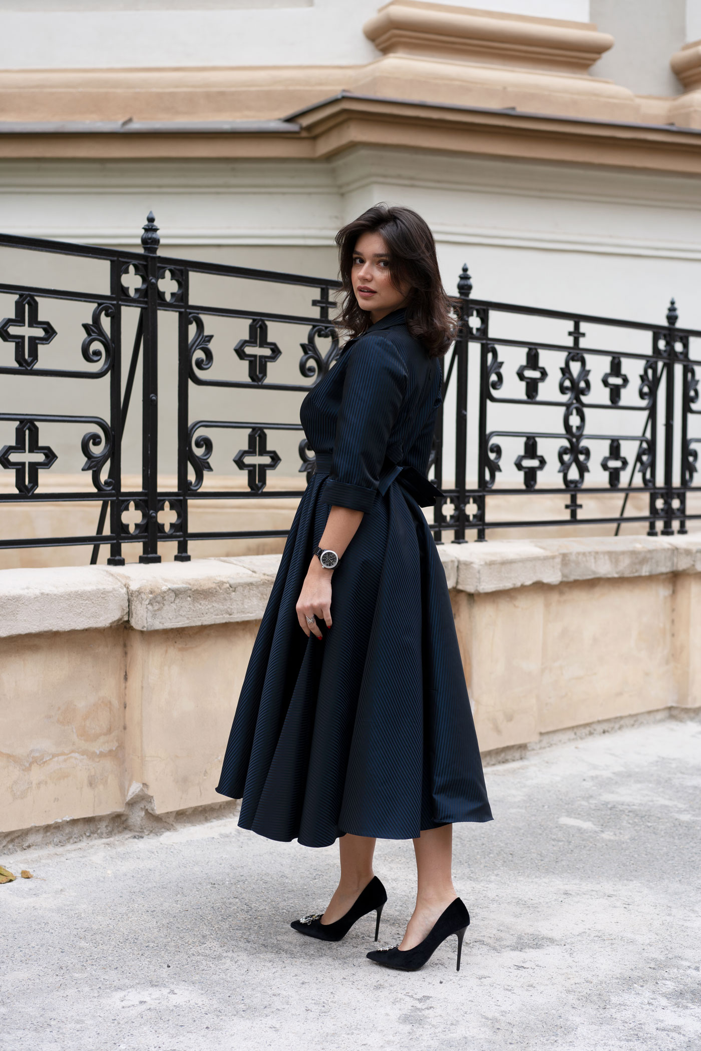 Rochie camasa tafta dungi navy, lungime midi, croită pe bie din tafta cu dungi navy si negre, cu partea de sus croi camasa, maneci pana la cot si funda la spate.