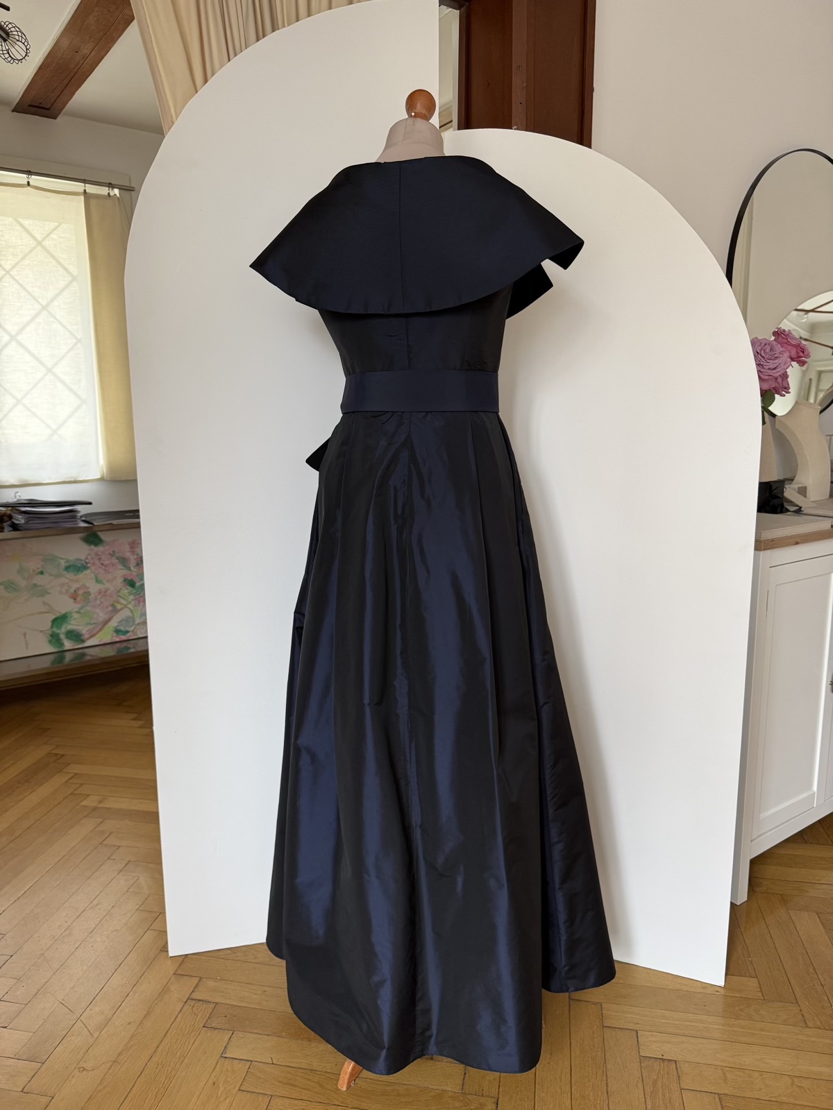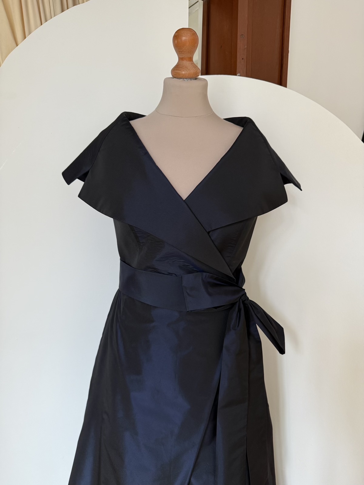 - Rochie GULER tafta fâș navy este o rochie lunga, cu croi pe drept in partea de jos, cu pliuri suprapuse la talie si bust petrecut, cu guler supradimensionat.