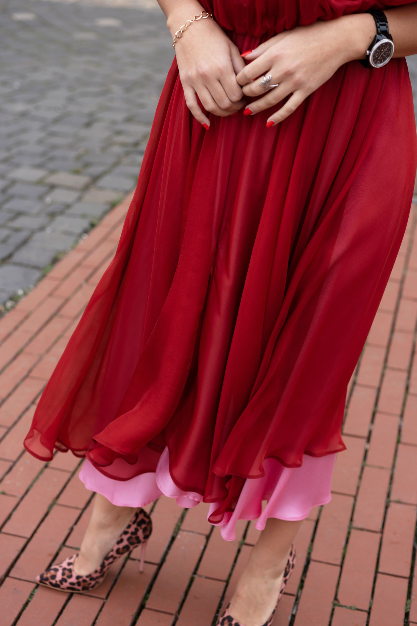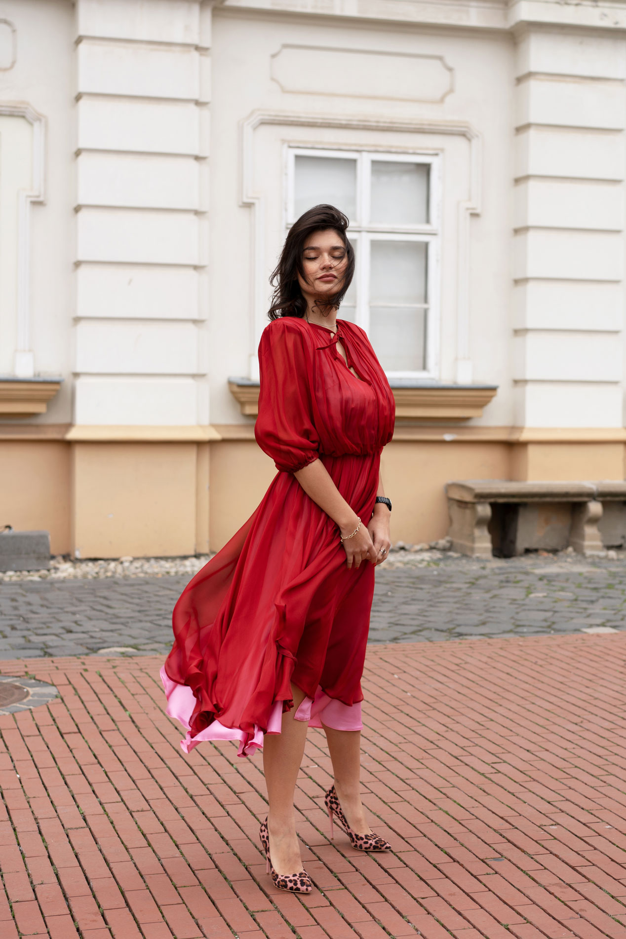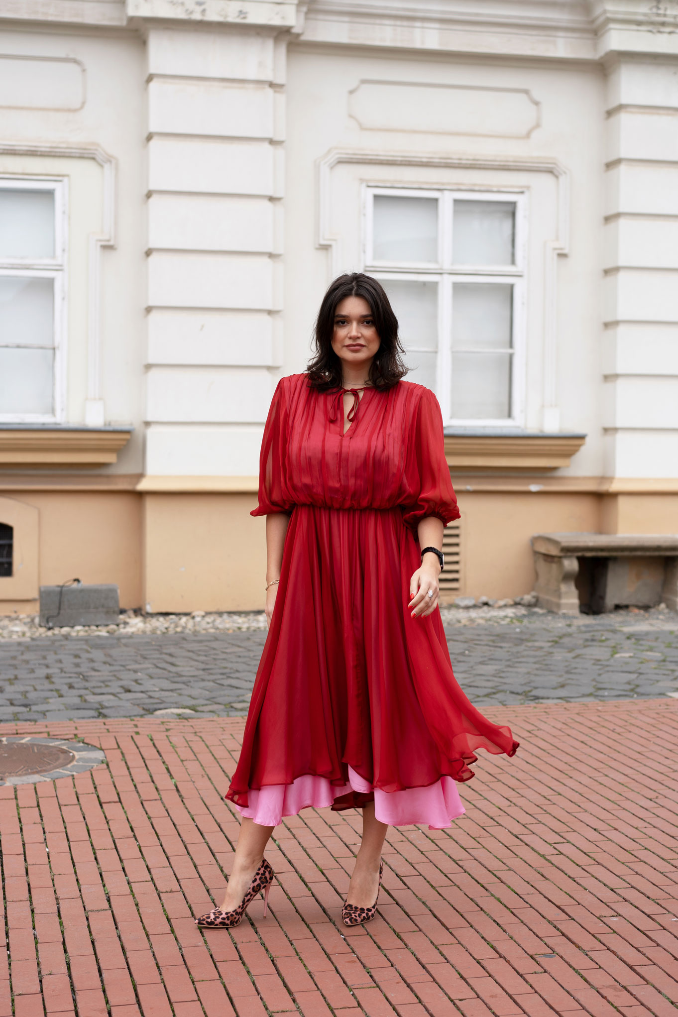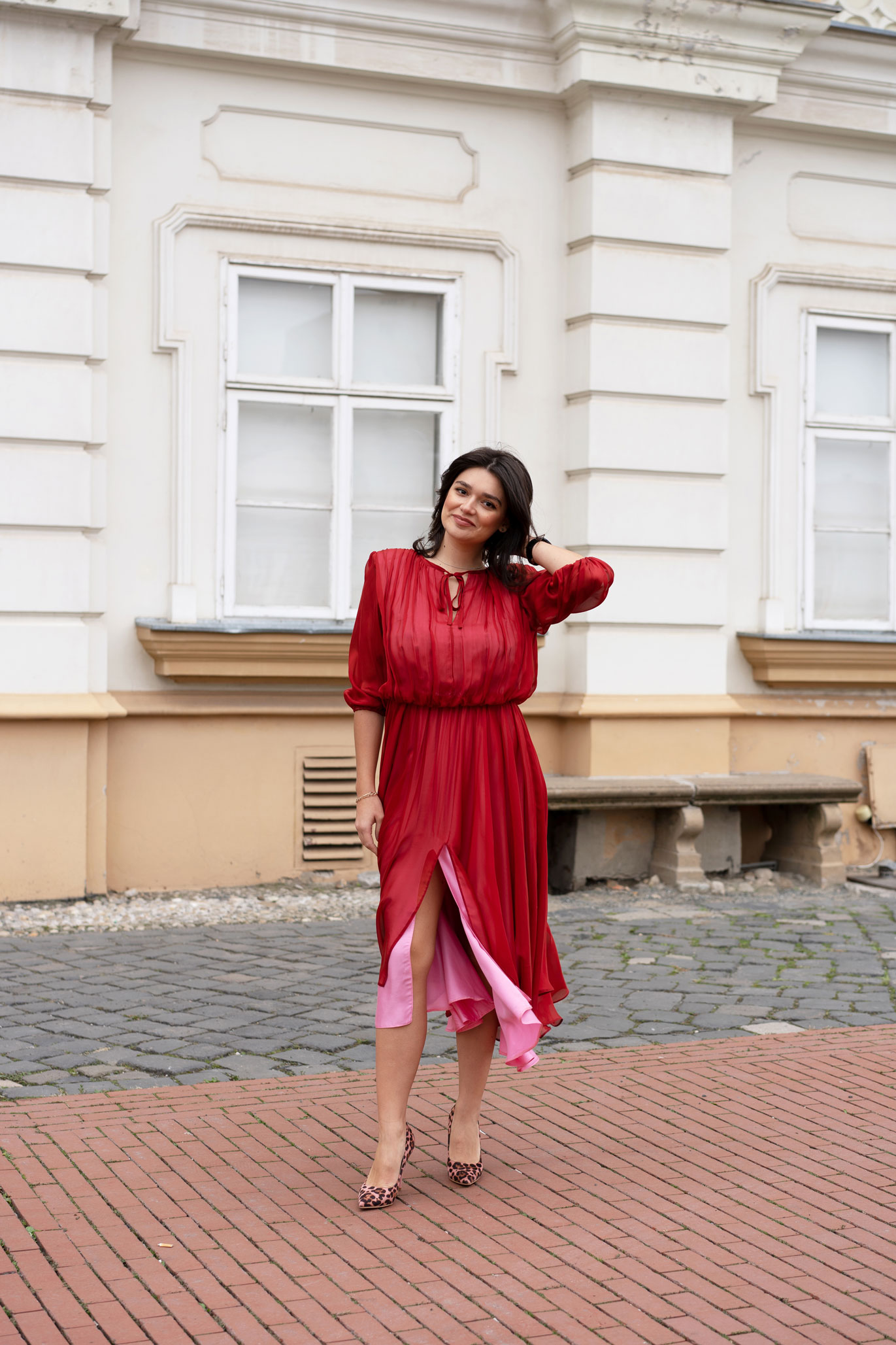 - Materialul ales este un voal de tip chiffon, pe nuanta rosu-visiniu, cu captuseala din batist roz bombon, care se vede in partea de jos.