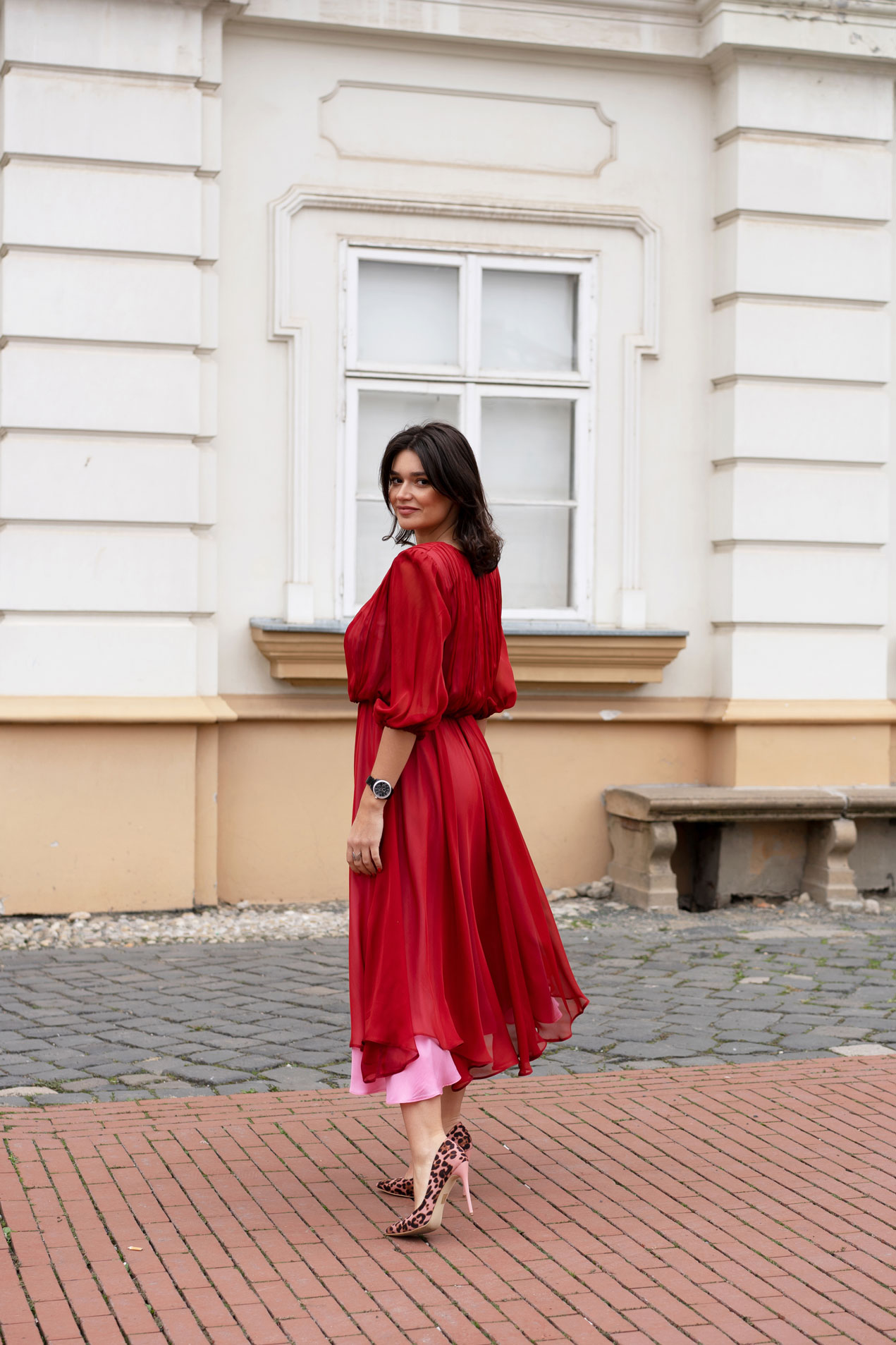 Rochie lejera voal marsala din matase naturala, bluzata in partea de sus, cu bureti pentru umeri supra-dimensionati, maneci pana la cot si croi amplu pe bie in partea de jos, cu lungime asimetrica.