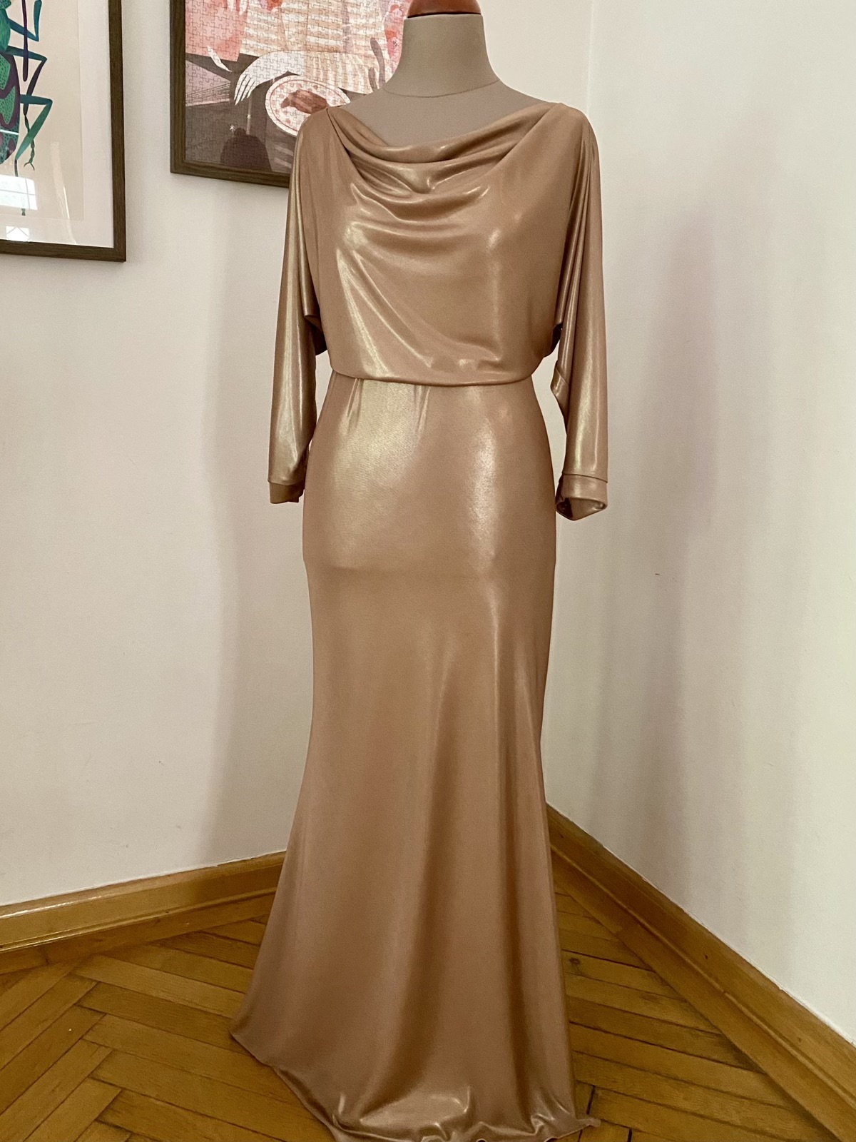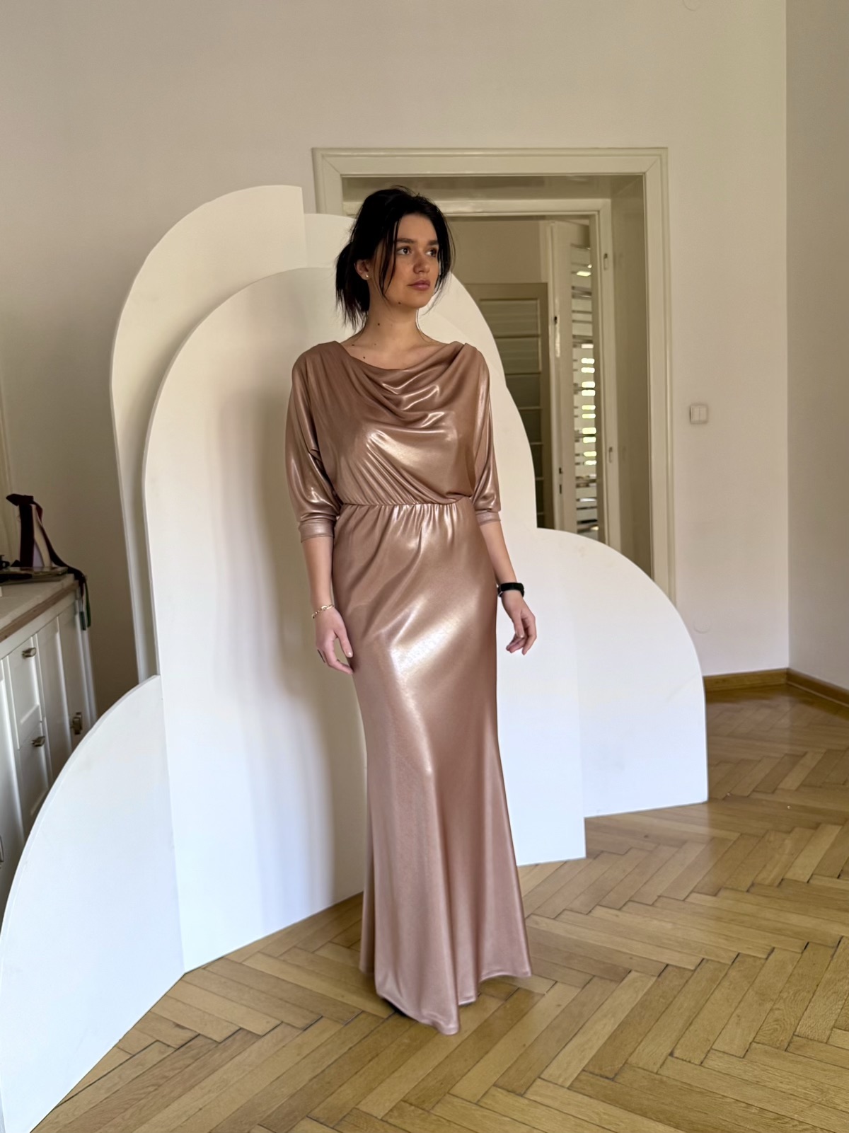 - Rochie LIQUID maxi jerse pelicula este o rochie lunga, cu croi pe bie in partea de jos si bust bluzat, larg si drapat in partea de sus, incretit in talie cu elastic.