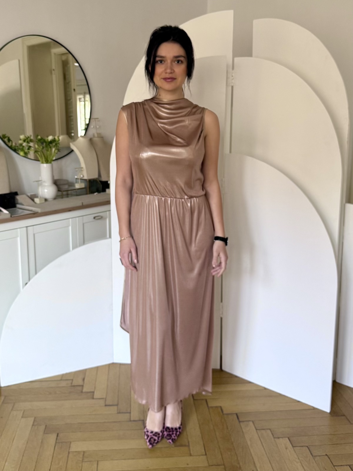 - Rochie LIQUID midi jerse pelicula este o rochie lejera, midi, cu croi drept, incretita in talie cu elastic si bust ce se drapeaza peste umar, intr-o esarfa lunga pe umar.