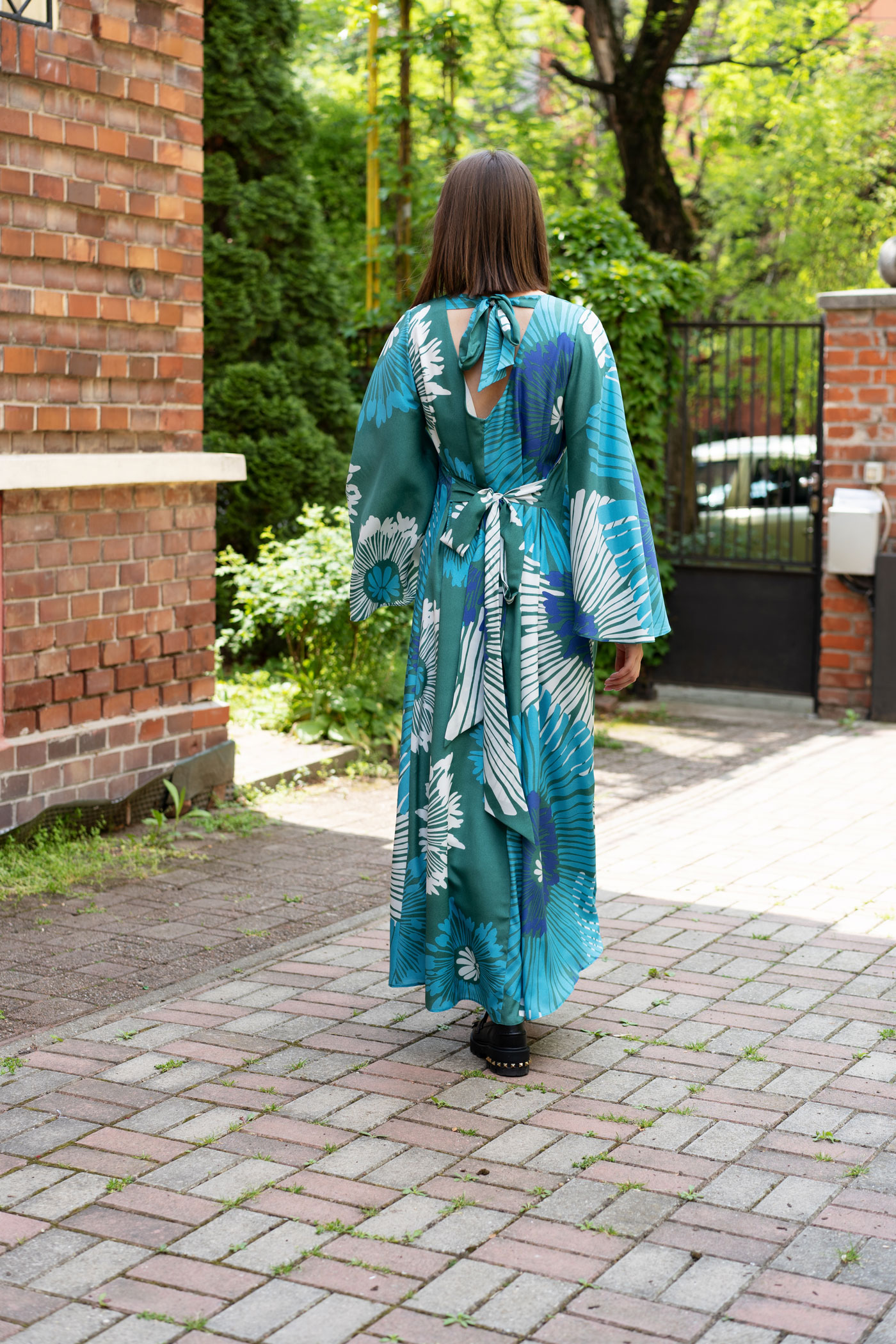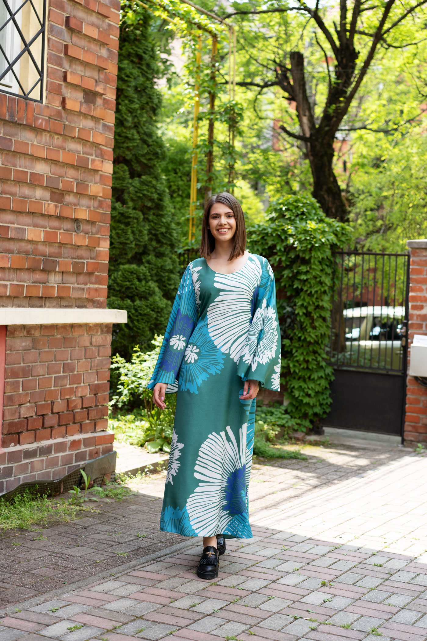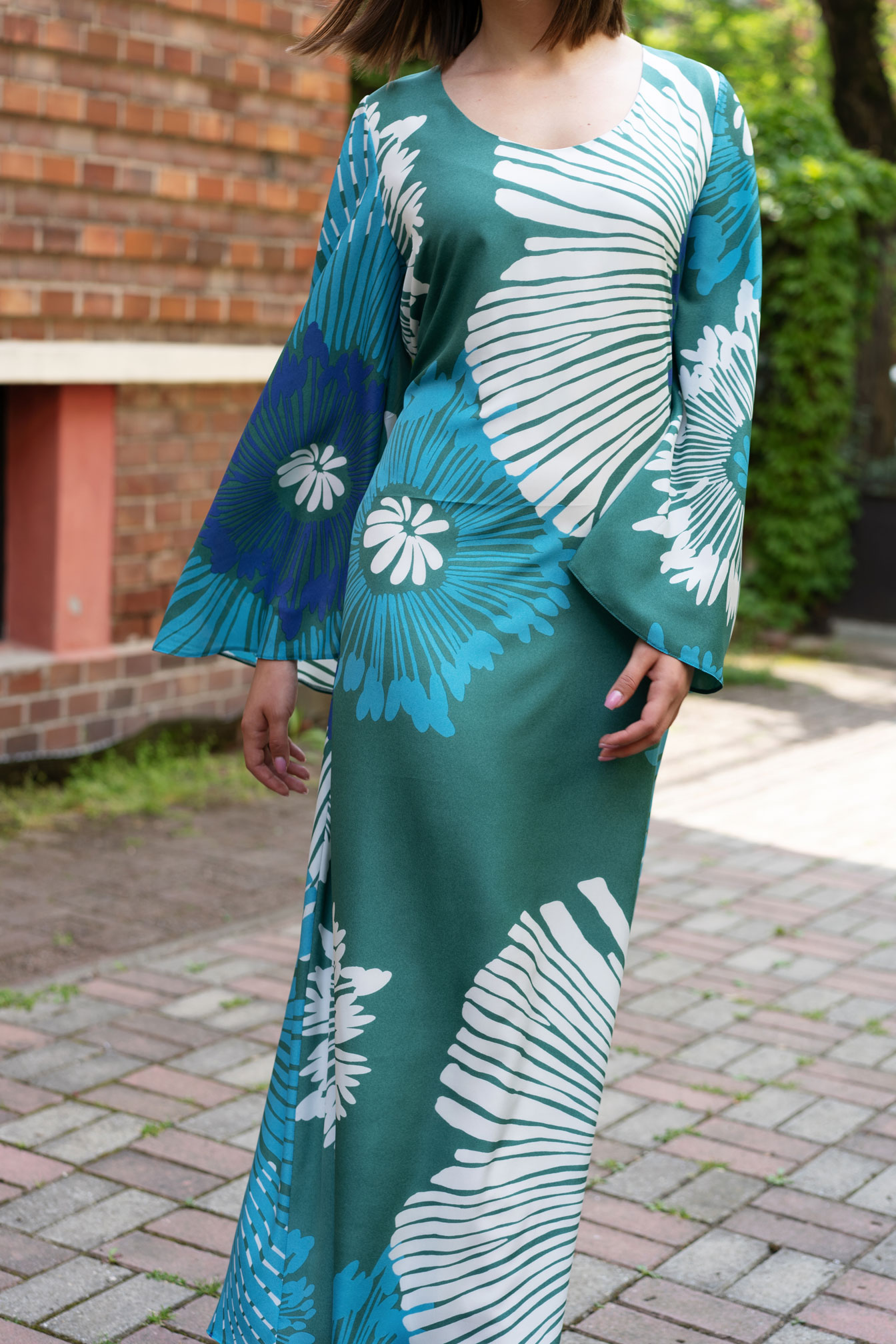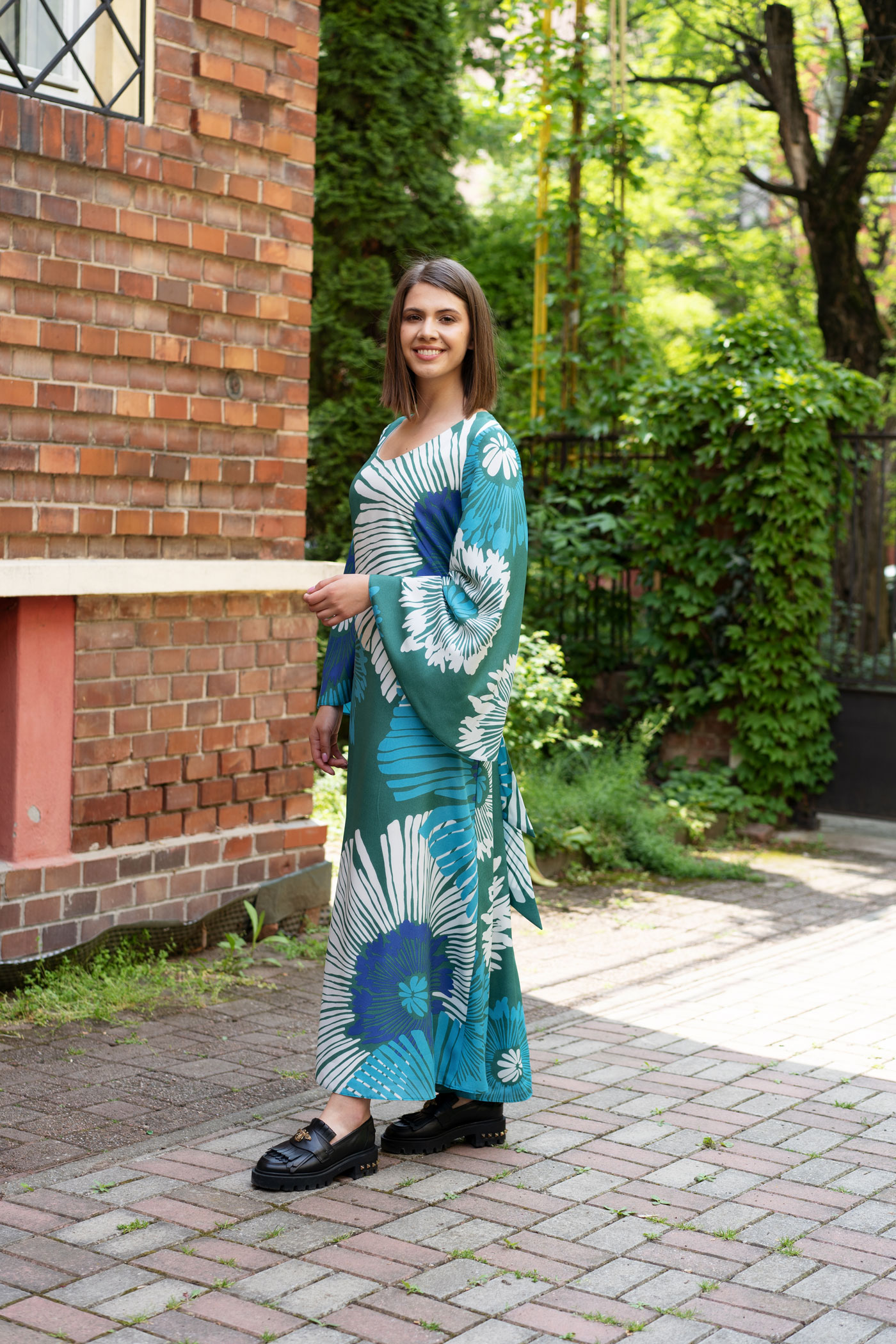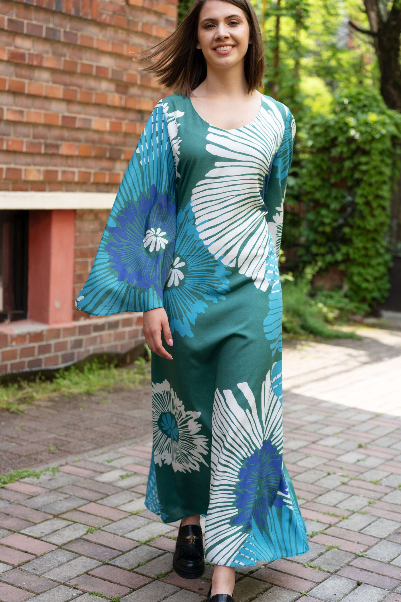 Rochie lungă cu mâneci evazate pe nuanța turcoaz vezuliu cu print flori retro.