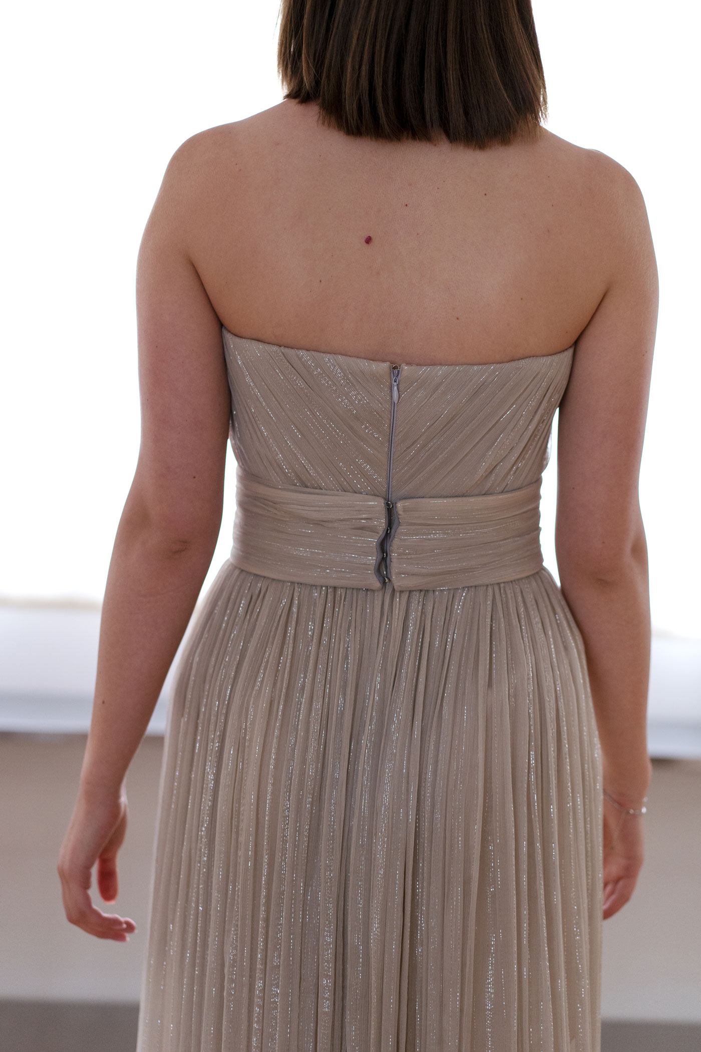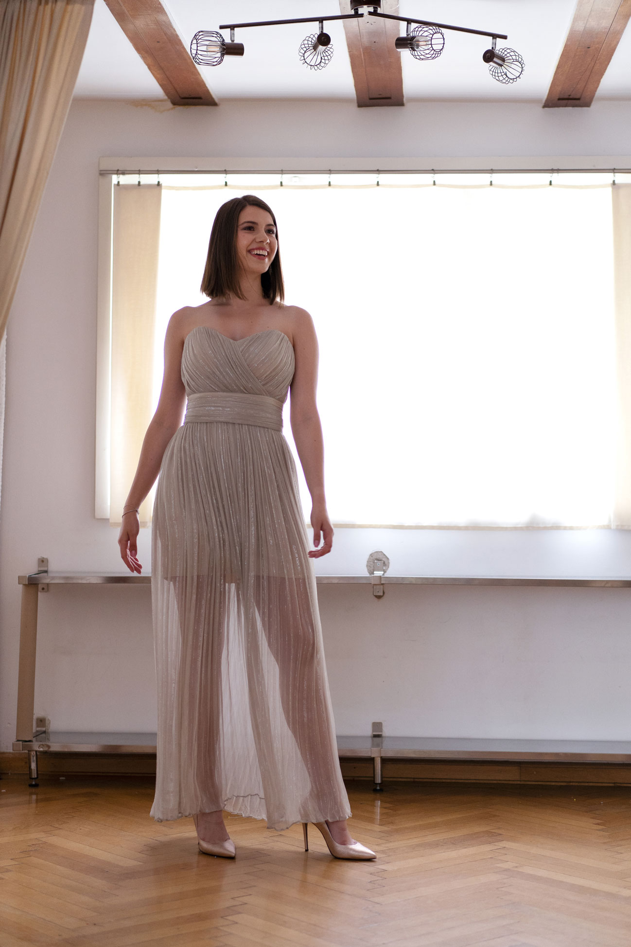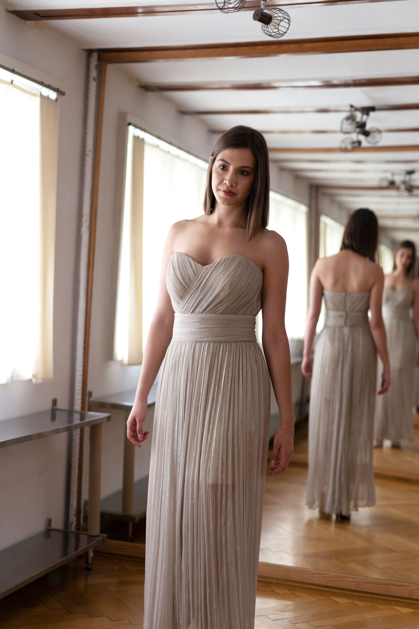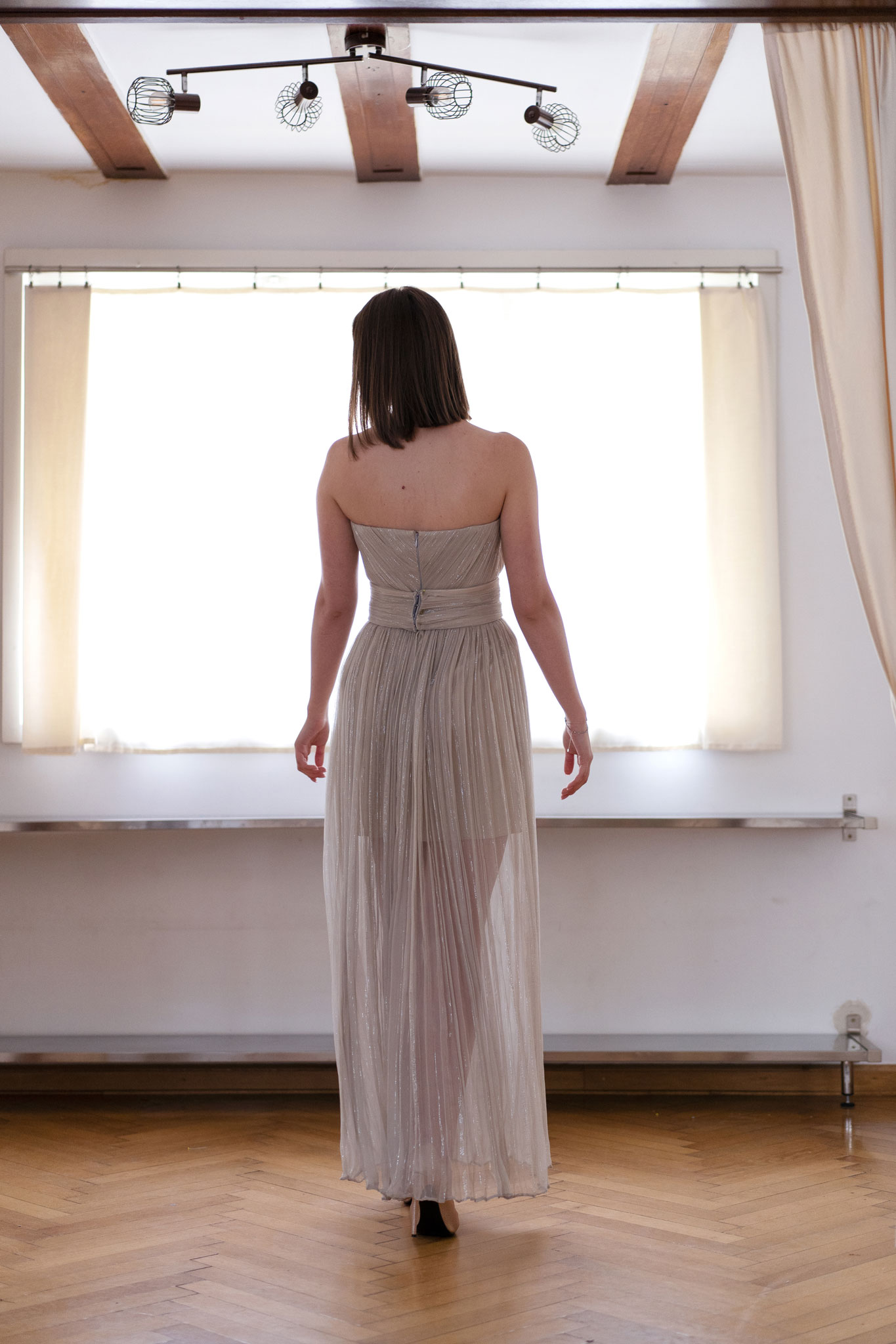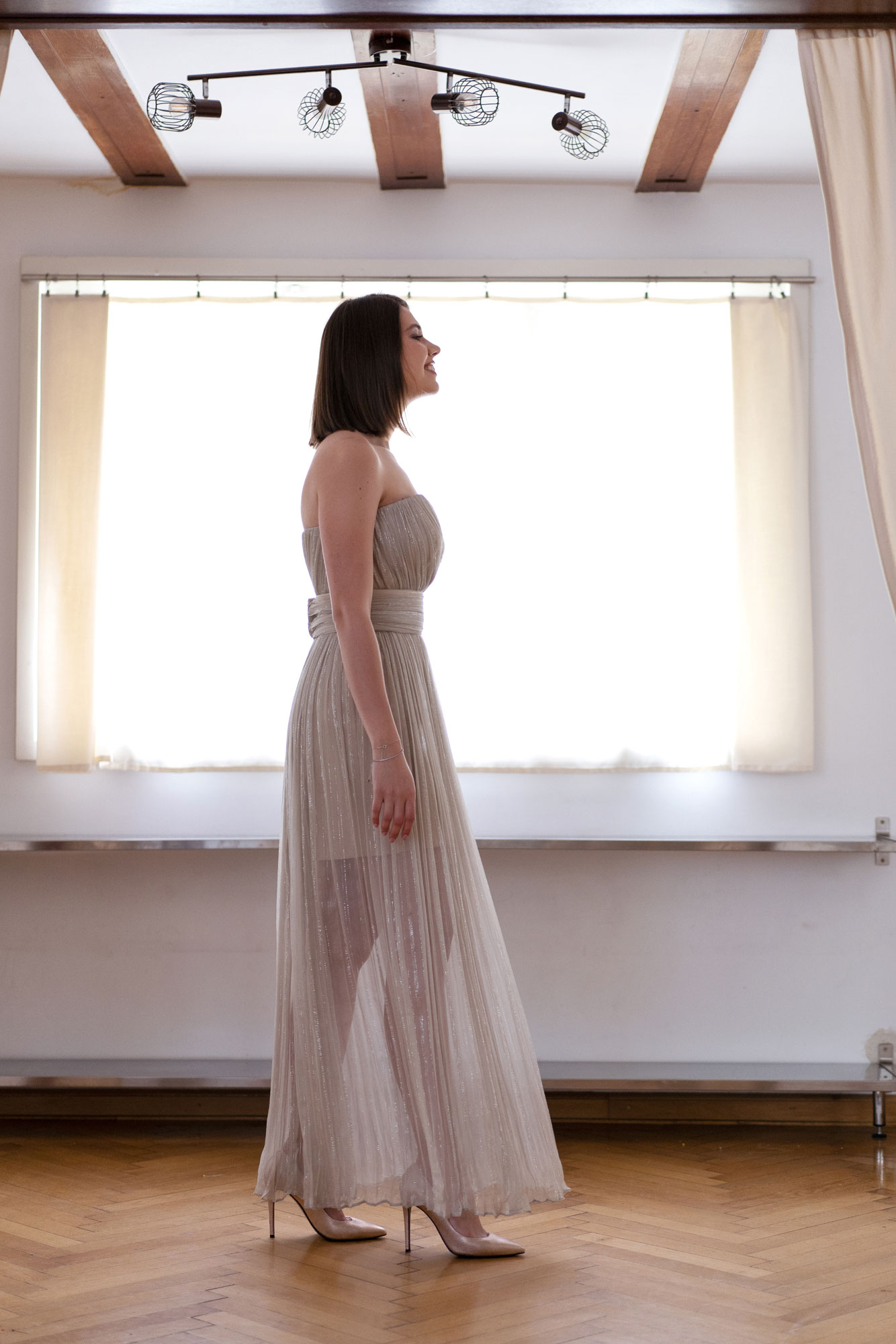 Rochie lungă din voal creponat gri cu corset fix integrat cu drapaj argintiu.