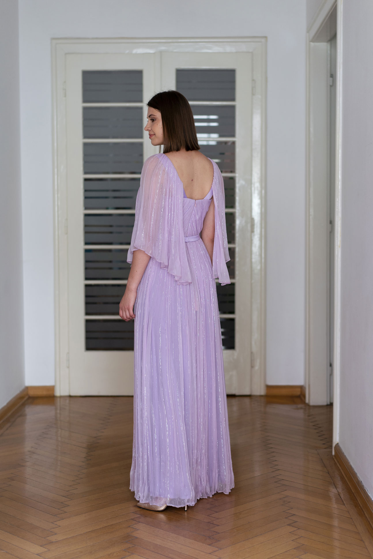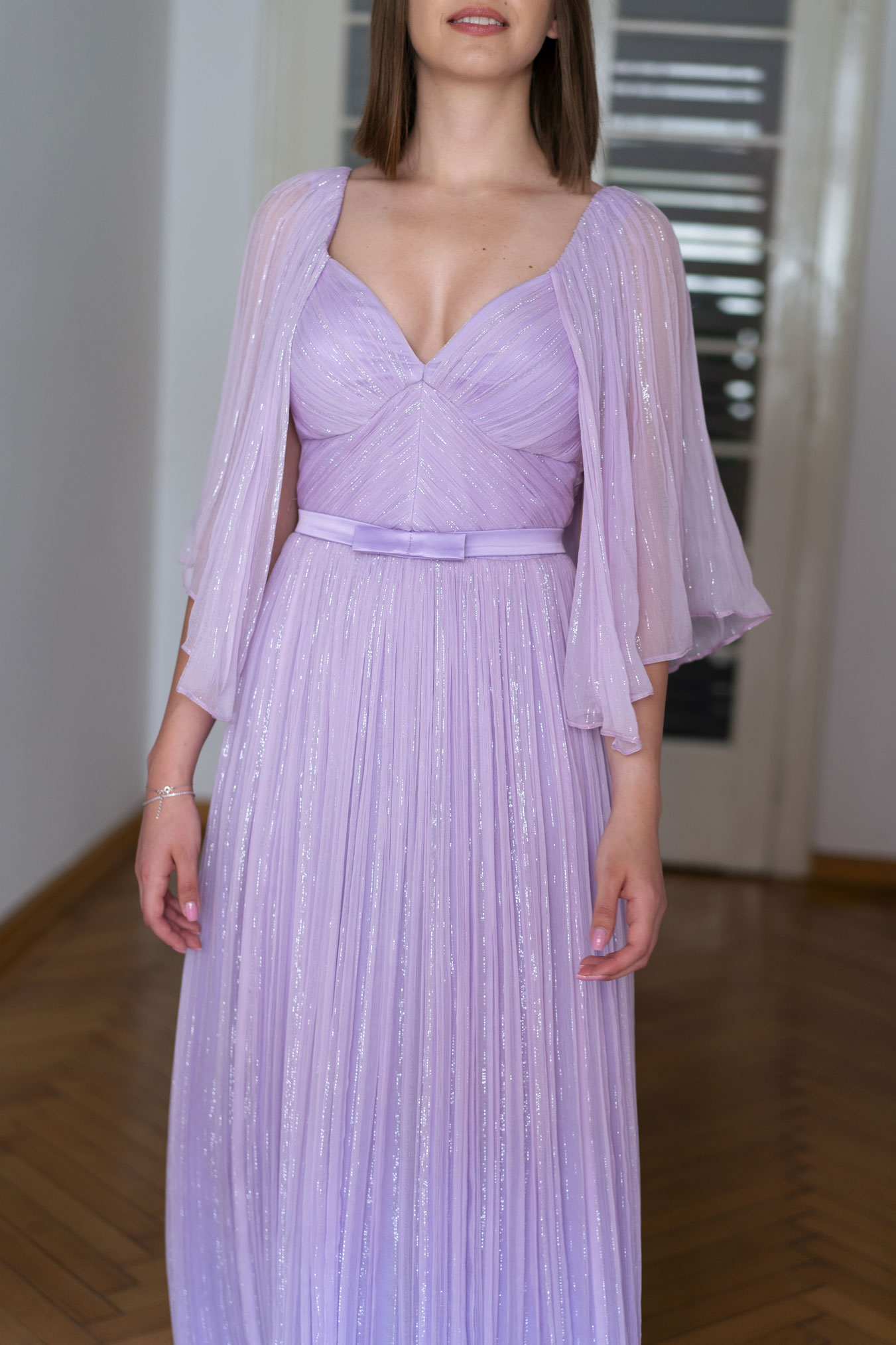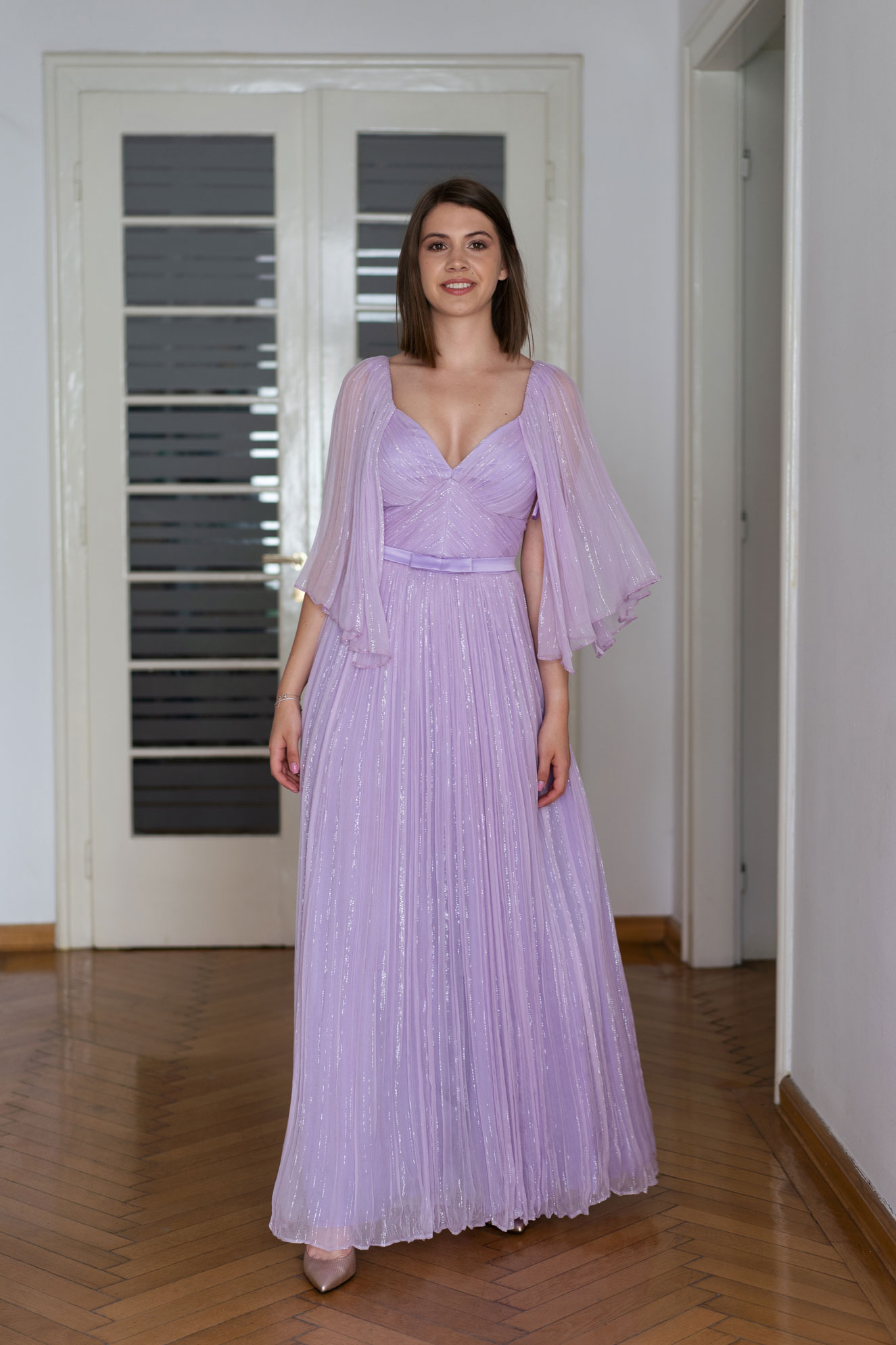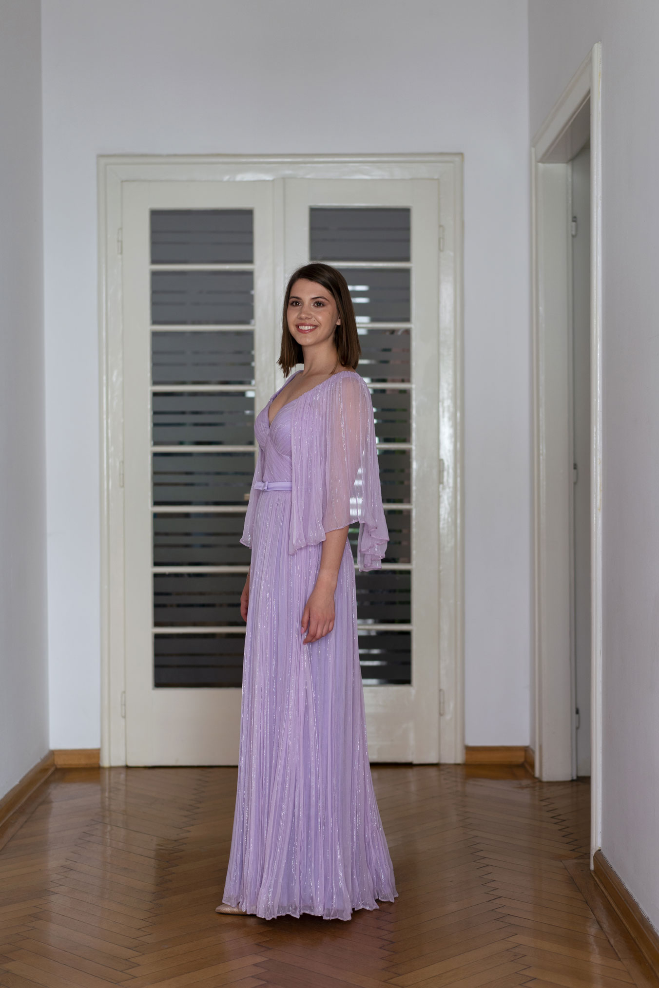 Rochie lungă din voal creponat lila, corset integrat cu drapaj, bretele și mâneci largi.Bentita din talie este aplicata manual, are o funda pe mijlocul de fata si e croita din tafta satinata.